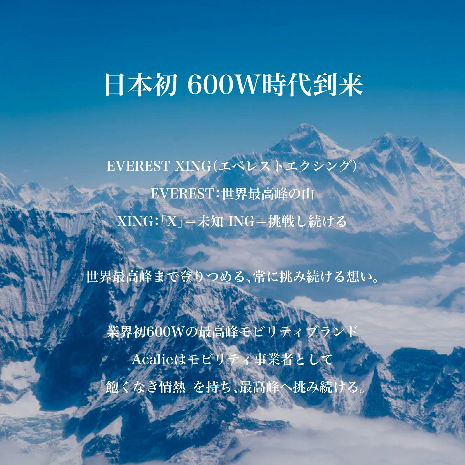 Acalieモビリティは、「最高峰の山、エベレストのように先進的で最高峰のモビリティを提供する」、「未知に挑戦し続ける」をコンセプトに「EVEREST XING(エベレストエクシング)」ブランドを2024年7月1日より立ち上げ、定格600Wモーターの電動キックボード「EX15シリーズ」を2024年8月28日に先行発売しました。9月12日までに予約販売第一弾400台が完売し、9月13日より第二弾スタートします。