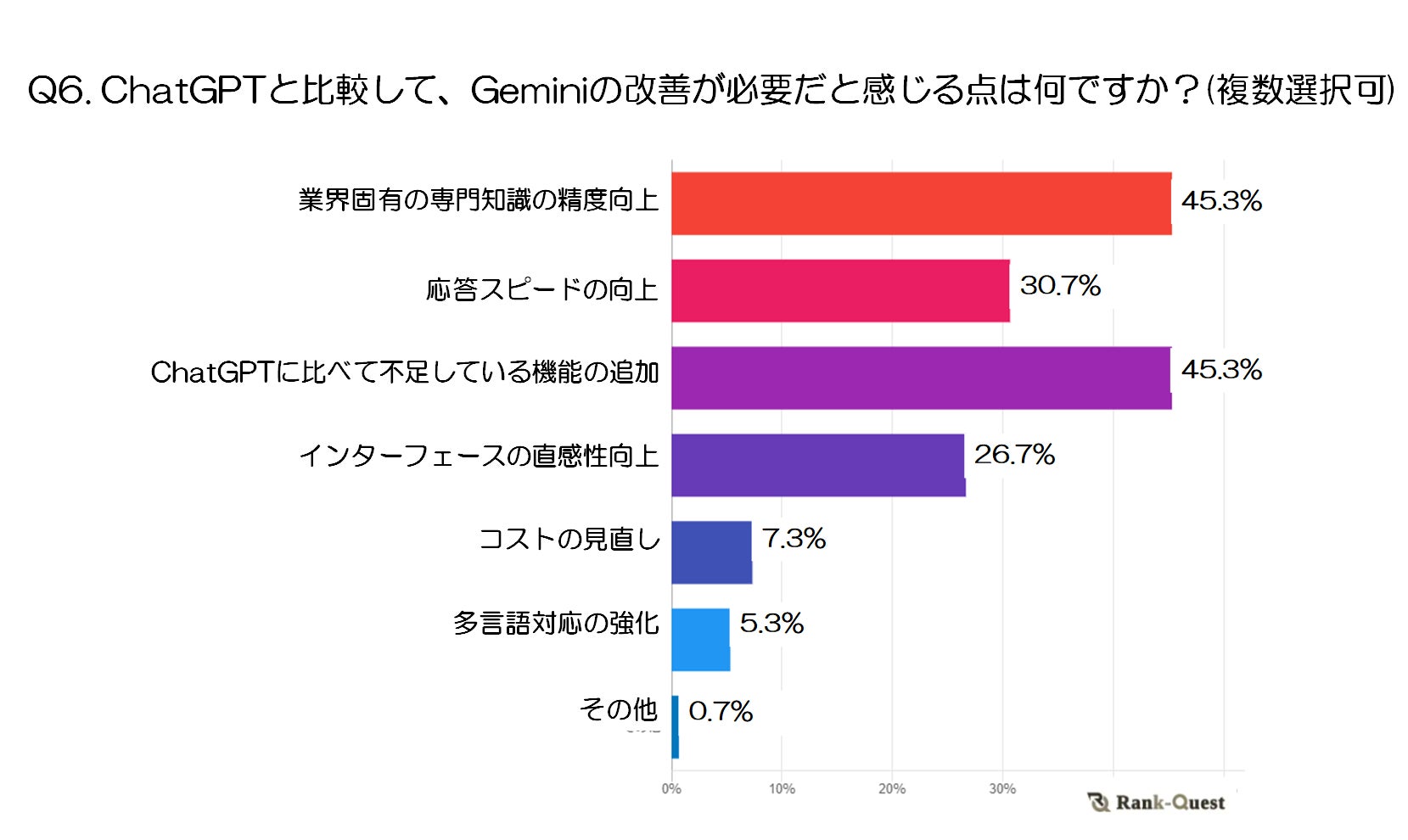ChatGPTと比較してGeminiの改善が必要だと感じる点として最も多かったのは、「業界固有の専門知識の精度向上」(45.3%)と「ChatGPTにはない不足している機能の追加」(45.3%)でした。
