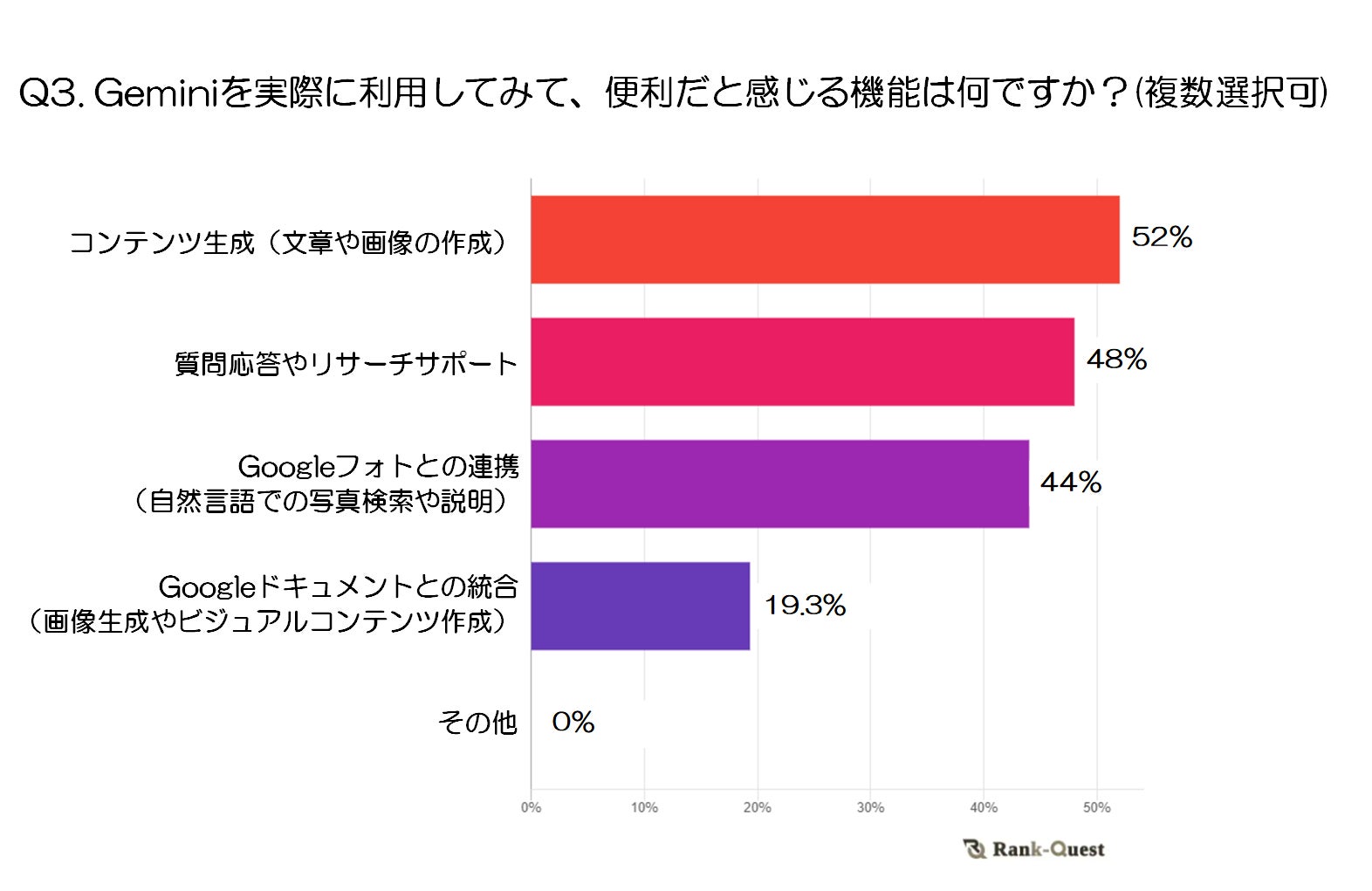 次いで、「質問応答やリサーチサポート」が48%、「Googleフォトとの連携(自然言語での写真検索や説明)」が44%となっています。「Googleドキュメントとの統合(画像生成やビジュアルコンテンツ作成)」は19.3%に留まりました。