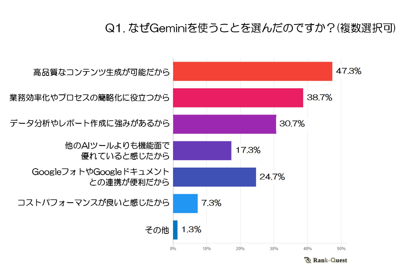 最も多かった回答は「高品質なコンテンツ生成が可能だから」(47.3%)であり、Geminiが他のツールと比べてコンテンツ生成能力で大きく評価されていることがわかります。
