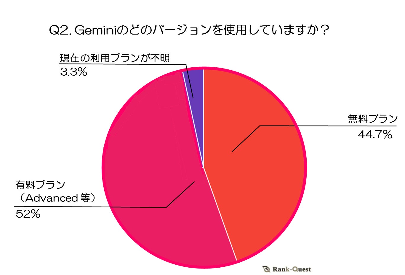Geminiの利用プランについて、有料プランが52%の支持を集め、最も多く利用されていることがわかりました。