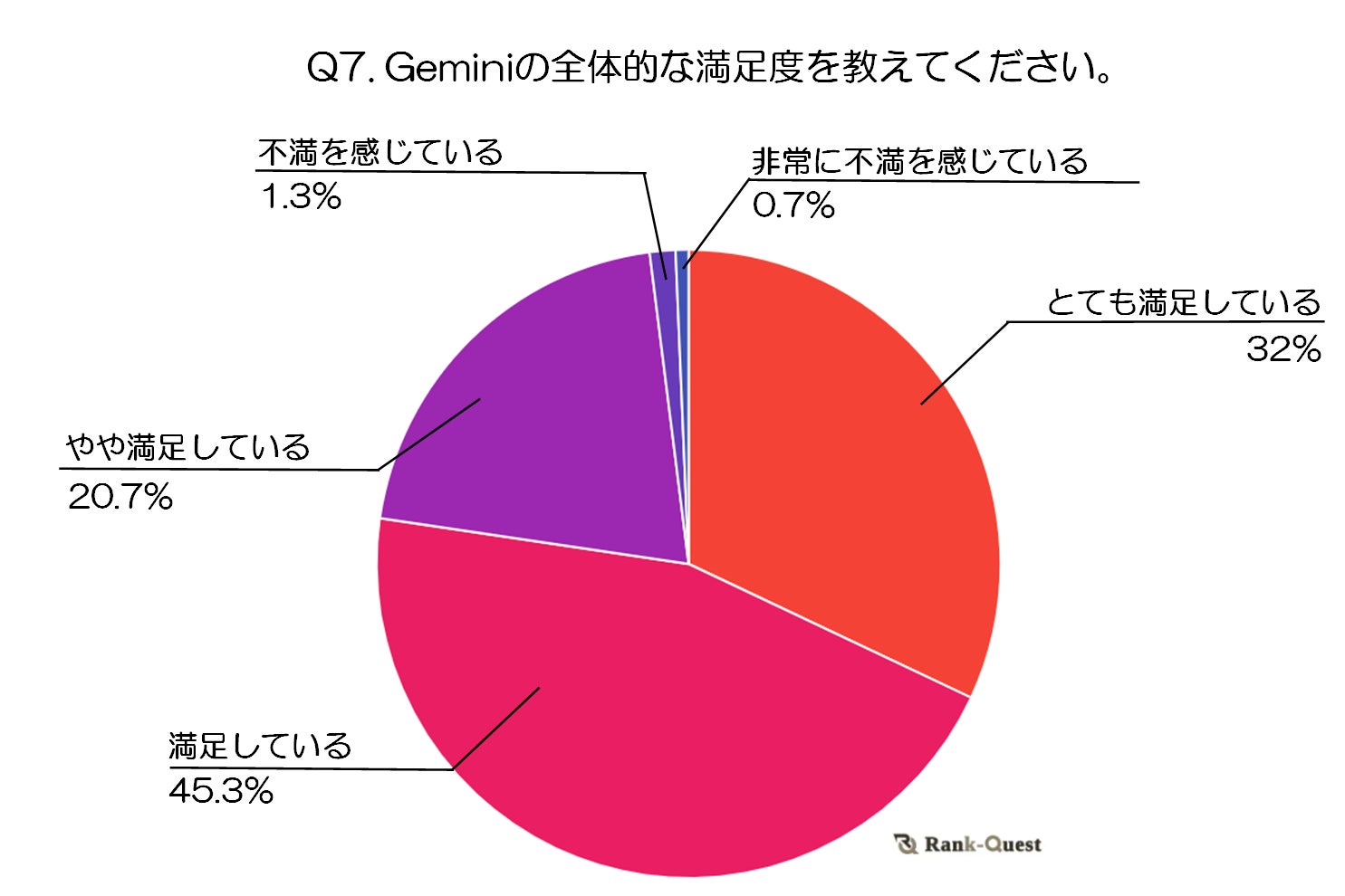 この結果から、大多数のユーザーがGeminiに対して概ね満足していることがわかります。特に「満足」「とても満足」の回答が合計77.3%を占めており、全体的にポジティブな評価が目立っています。