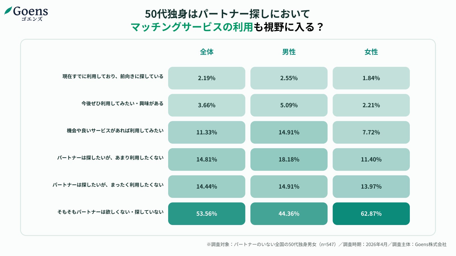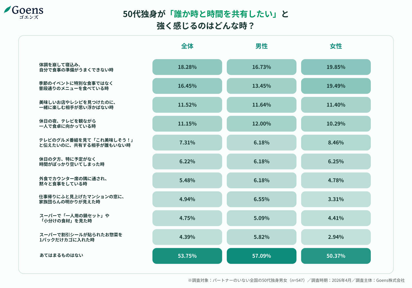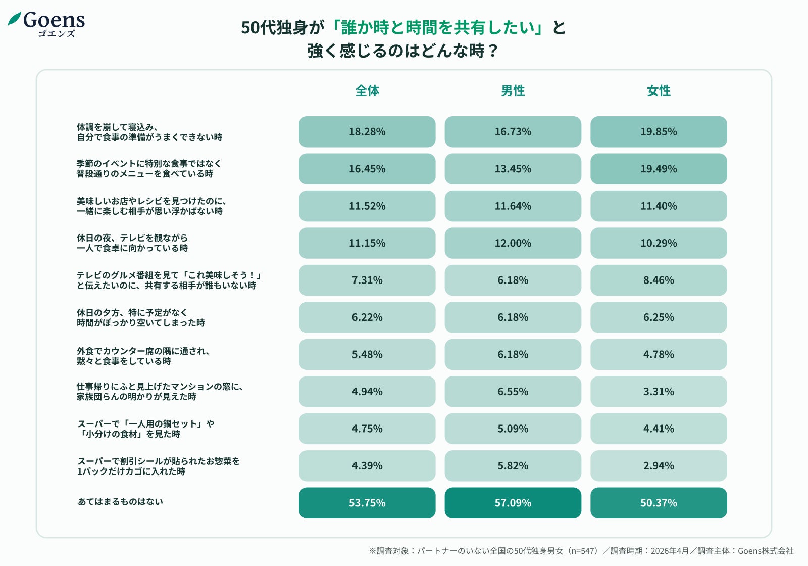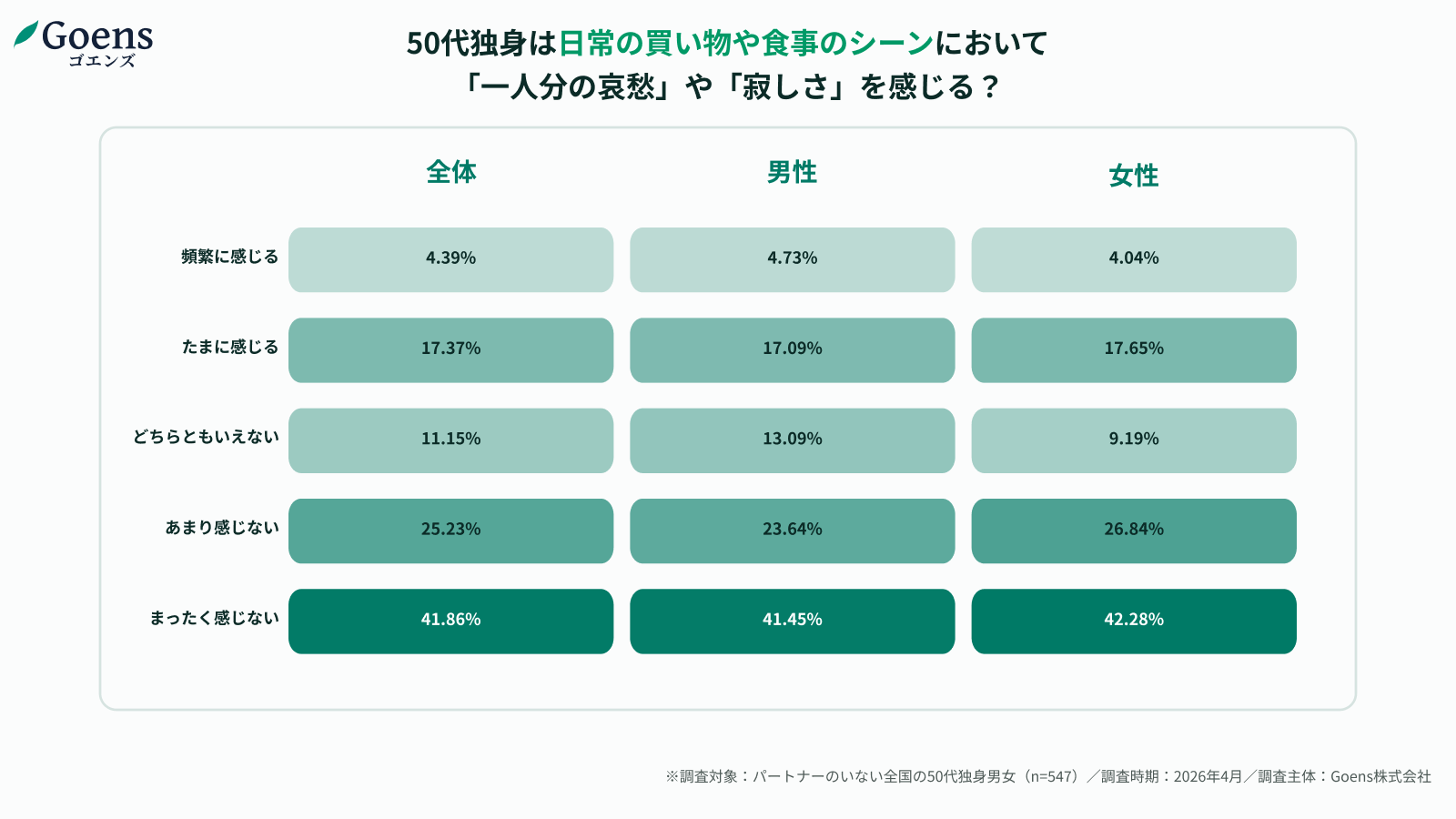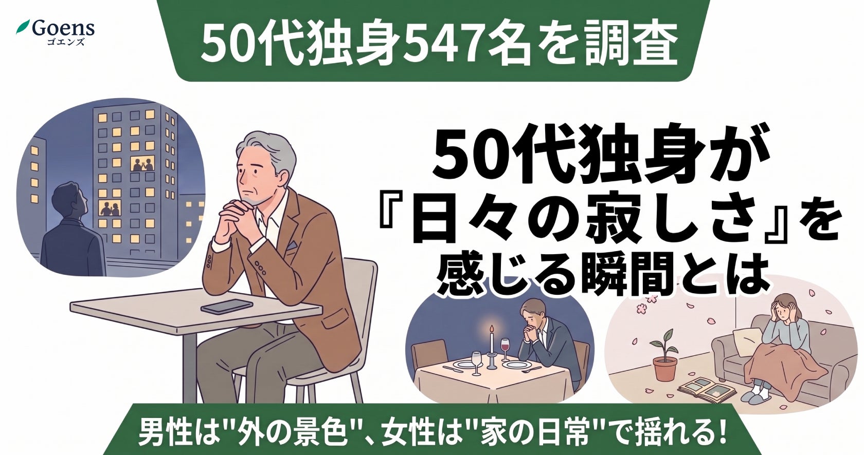 50歳以上限定のマッチングアプリ「Goens(ゴエンズ)」(運営:Goens株式会社/本社:愛知県名古屋市/CEO:廣澤 和也)は、全国のパートナーのいない50代独身男女を対象に、「一人の哀愁」を感じる瞬間と、新しい出会いの場に対する意識について調査を実施しました。