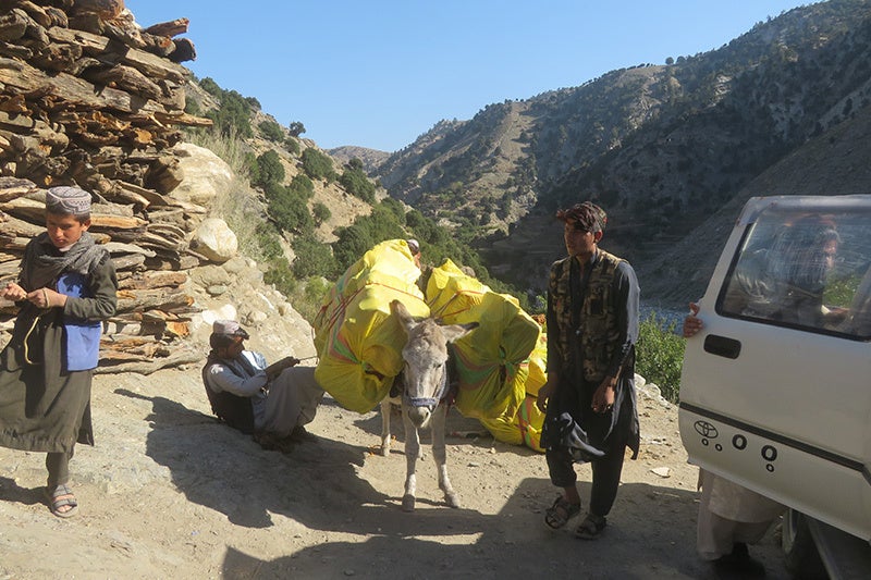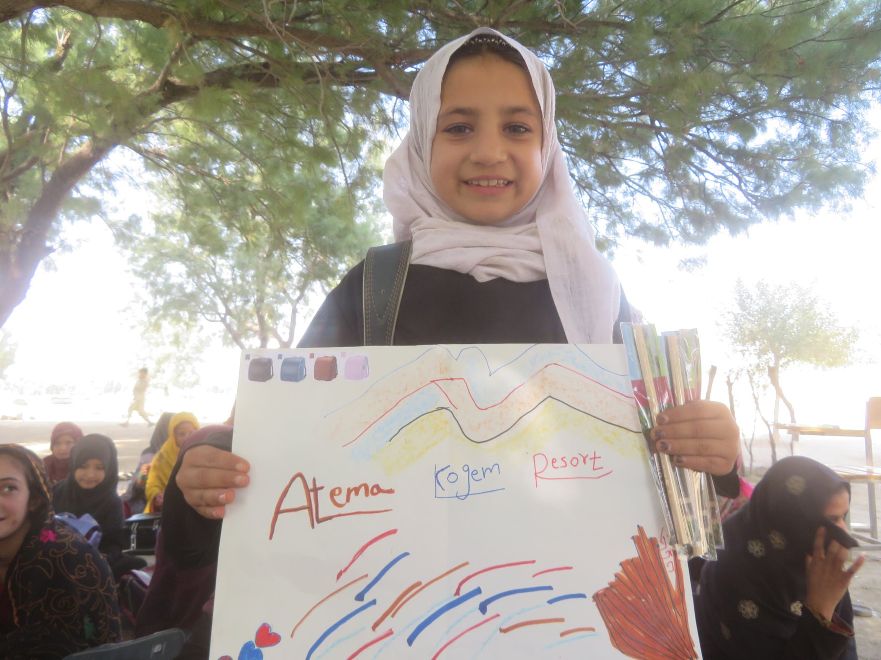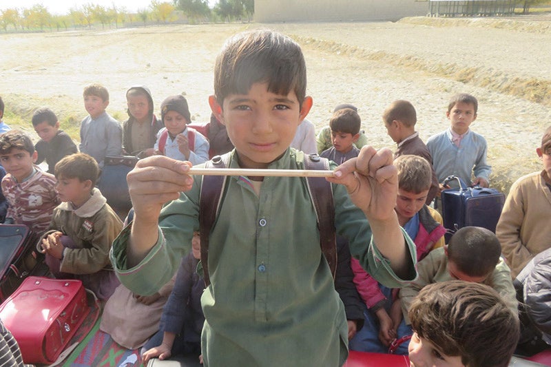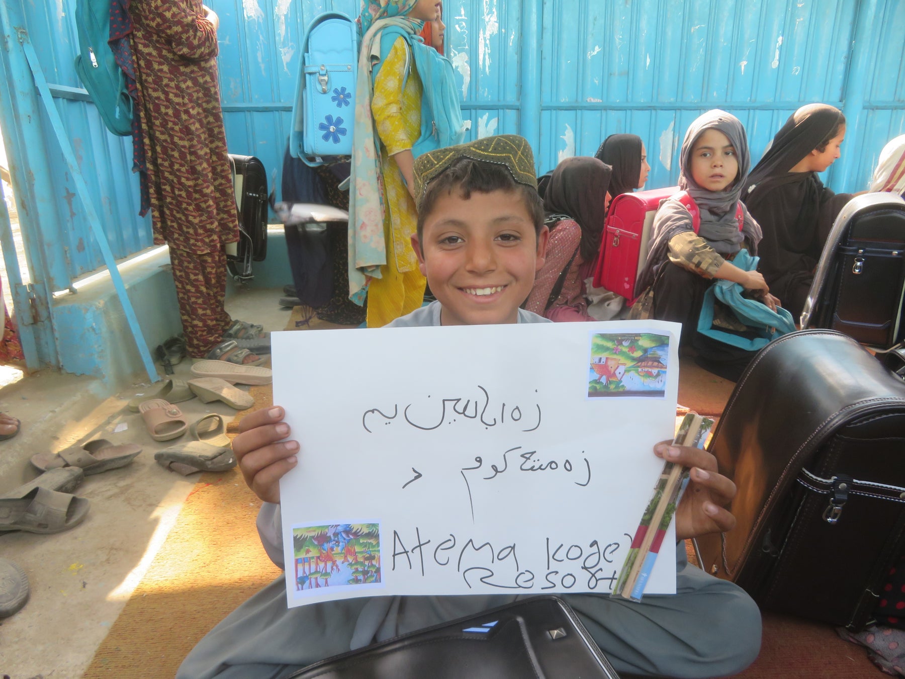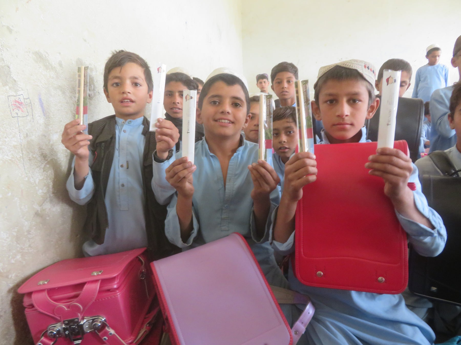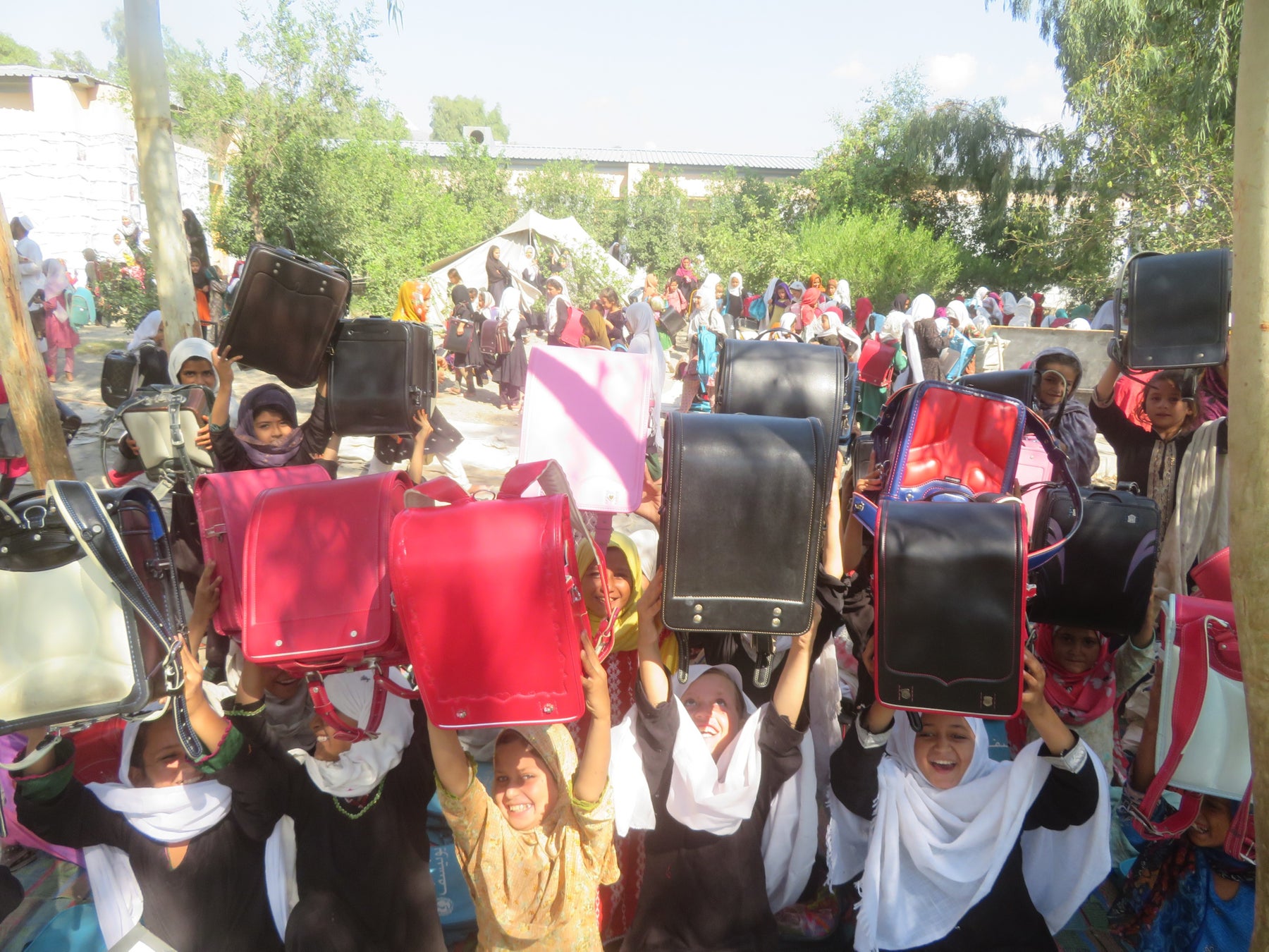 ジョイセフがランドセル配付を実施している地域(アフガニスタン ナンガハール州)では小学校の半数以上が校舎や机、椅子などもない青空教室のため、黒板とゴザしかない環境で学んでいる子が多いのが現状です。買い物袋や手持ちで教科書を携え通学する子どもたちが多いことから、子どもたちが何をしているのかが分かりづらく、地域の中で学校が目に見える形になっていません。