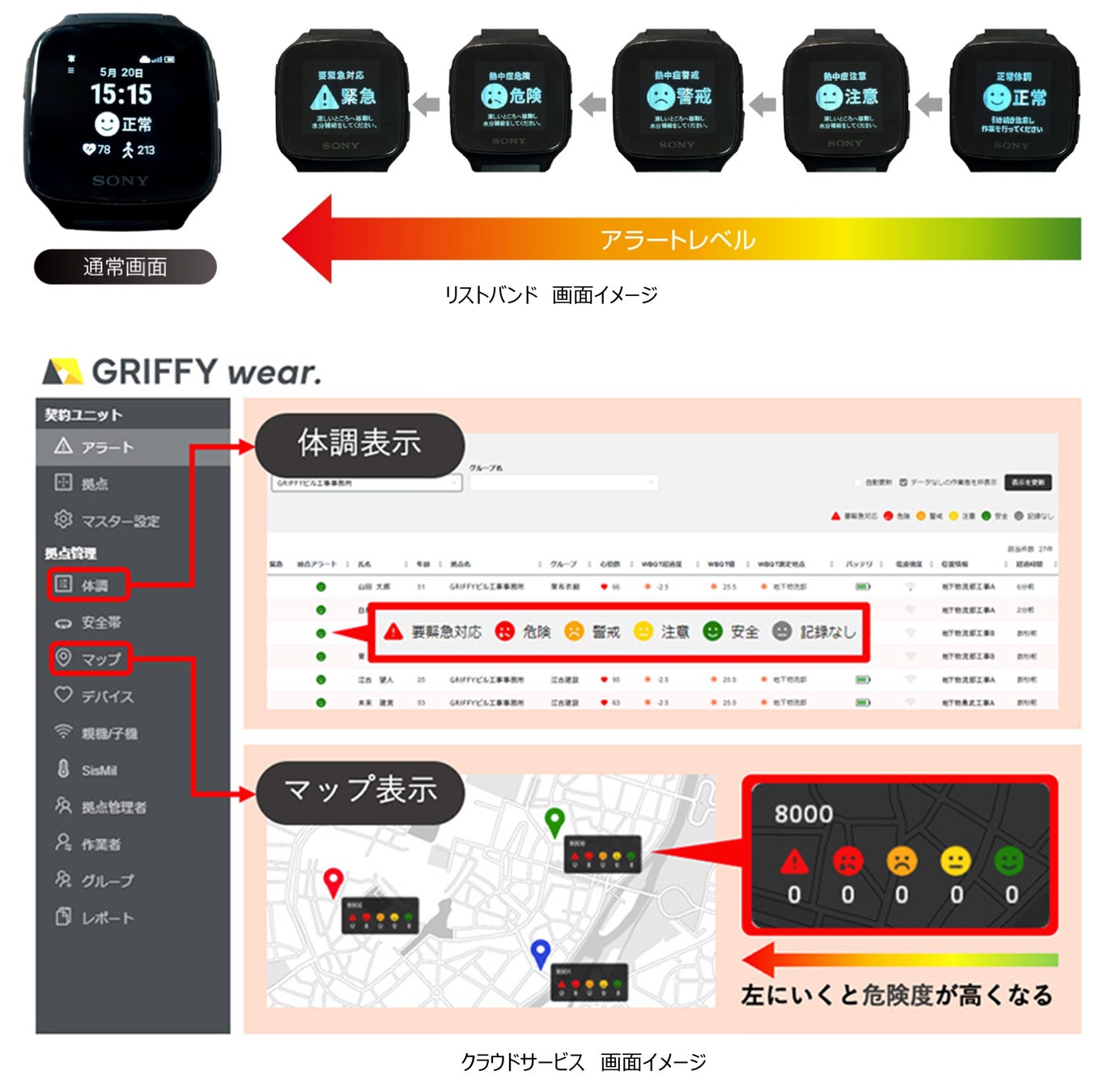 ○株式会社大林組と共同開発を行い、2024年に大林組が施工する約60現場、約3,000人の作業員に導入された「GenVital」と同様、大林組が開発した体調管理判定アルゴリズムを使用します。その上で、心拍数を計測するリストバンド※から、専用クラウドサービス「GRIFFY wear.」に直接LTE通信でデータを送ることで、リストバンドを現場作業員が装着するだけで使用可能です。