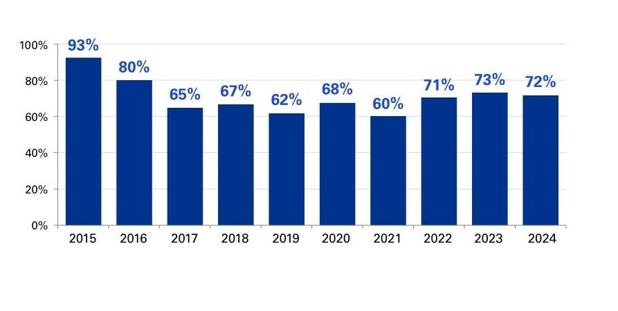 本調査によると、今後3年間の世界経済の成長見通しに自信を持っているCEOの割合は、調査開始時の2015年(93%)よりも低くなっているものの、昨年、一昨年とほぼ同水準の72%と堅調な結果となりました(図1)。この自信は今後の採用計画にも表れており、2021年以降で最も高い割合となる92%のCEOが2024年に従業員数を増やす意向を示しています(図2)。一方で、72%のCEOが大企業を率いることや、ビジネスを長期的に成功させるために前年よりも重圧を感じていると回答しており、成長に対する最大の脅威は、サプライチェーンの課題が最も多く、オペレーショナルリスク、サイバーセキュリティ、そして昨年最も多かった地政学的不確実性が続いています(図3)。