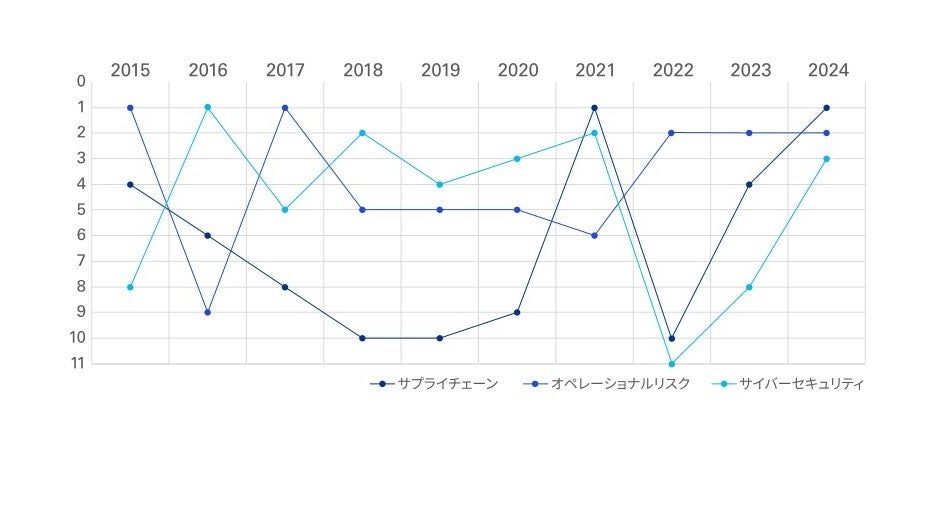 企業が成長するにあたり、最大の脅威は、サプライチェーンの課題、オペレーショナルリスク、サイバーセキュリティであり、前回調査で最上位であった地政学的不確実性が次に続く