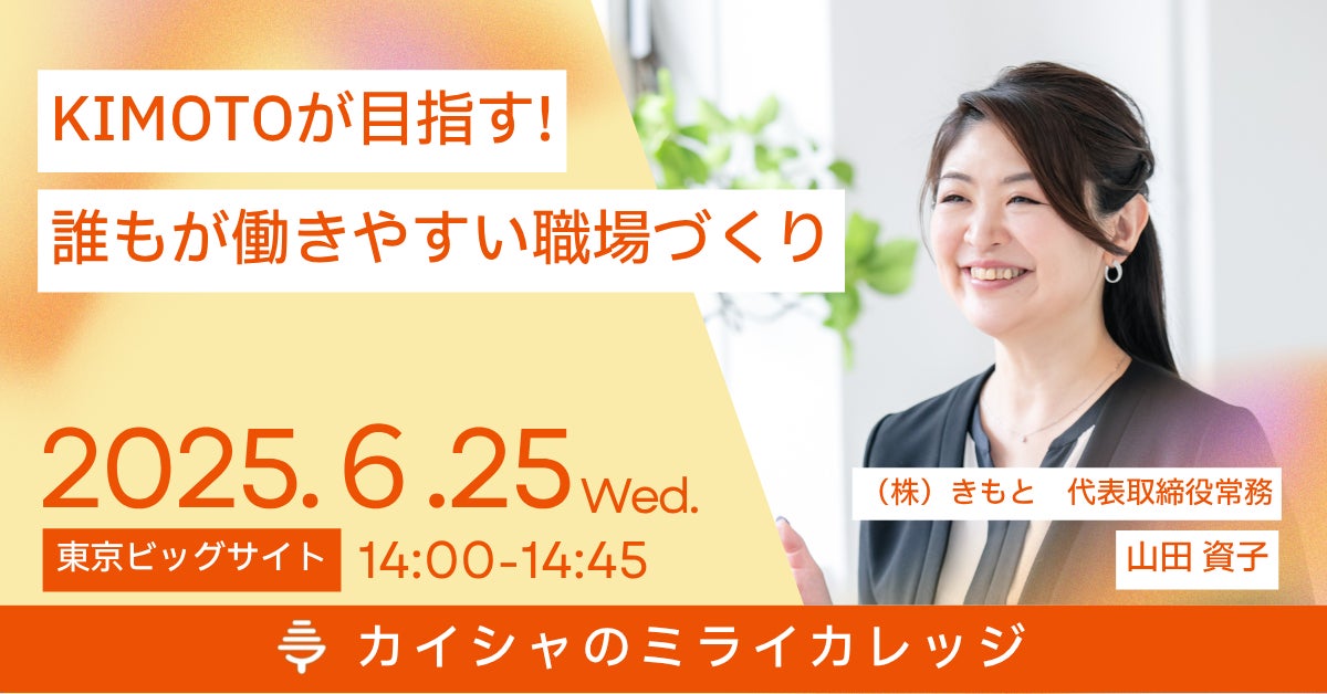 今回、KIMOTOの変革をけん引してきた代表取締役常務・山田資子が、東京ビッグサイトにて開催される「カイシャのミライカレッジ2025」に登壇。自ら旗振り役として改革を進めてきた立場から、「働きやすさ」と「働きがい」を両立させるための組織づくりや、社内のコミュニケーション設計、制度と意識の両輪をどう育ててきたかを、実例を交えて紹介します。