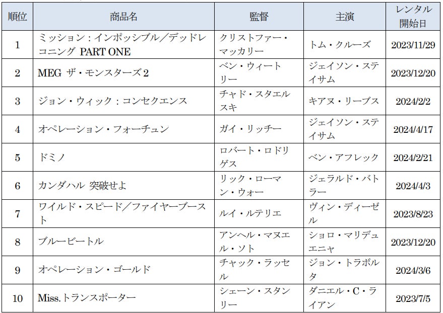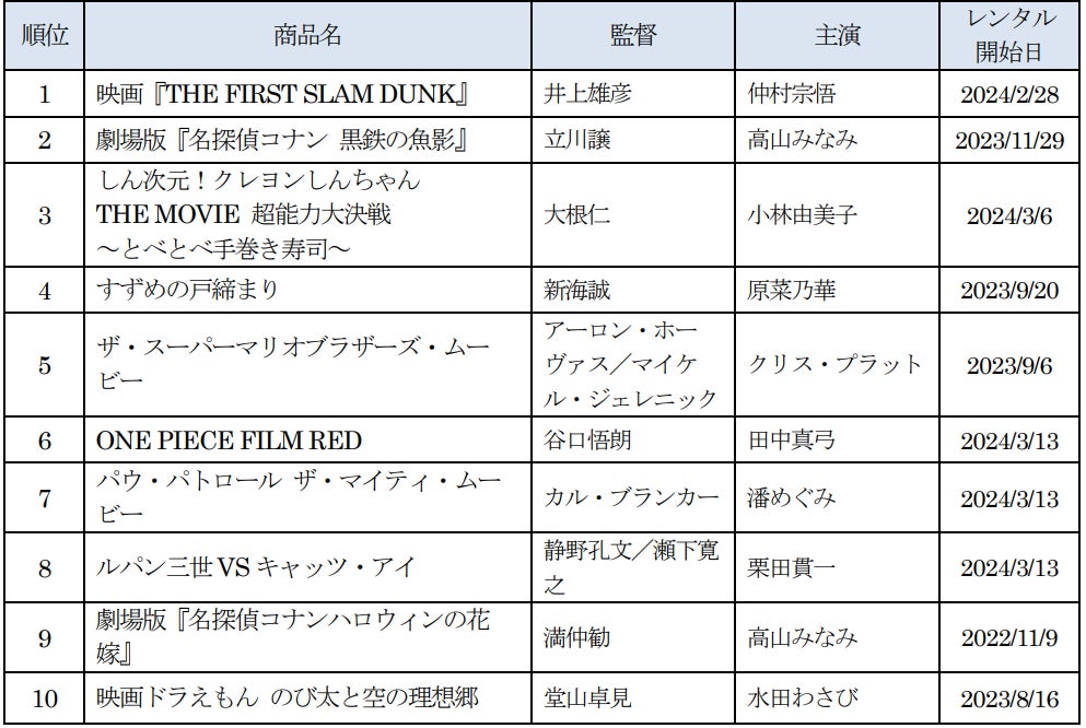 アニメでは、公開から半年以上のロングランとなった映画『THE FIRST SLAM DUNK』が、堂々の総合1位!興行収入158億突破の勢いのまま、レンタルでもたくさんのお客さまに見ていただきました。アニメ2位には、総合でも4位の劇場版『名探偵コナン 黒鉄の魚影』が続いています。邦画では、実写版シリーズ第3弾となる「キングダム 運命の炎」が総合2位に、「映画『ミステリと言う勿れ』」が総合3位など大人気コミックの実写版が並びました。洋画では、トム・クルーズ主演の人気シリーズ「ミッション:インポッシブル/デッドレコニング PART ONE」、ジェイソン・ステイサム主演「MEG ザ・モンスターズ2」と続きました。