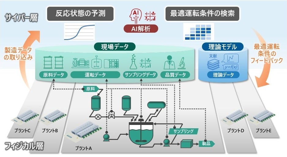 従来、プラントの現場では、サンプリングした製品の状態や品質を確認・監視しながら、熟練者がDCS*3操作値の補正や追加操作により反応を制御しています。本システムはAIなどを用いた反応予測モデルにより、サイバー空間上にプラントの運転状況を再現するとともに、プロセス・インフォマティクスの活用で、目標とする品質値に向けた調整タイミングや投入量を決めるための最適な運転条件を導き出し、それらをフィジカル空間(現場)にフィードバックすることを可能にしています。これにより、現場でのサンプリング確認回数の低減、品質の安定化、作業員の作業効率向上、新製品導入時の立ち上げ期間短縮に寄与し、フロントラインワーカーの負担軽減と生産性向上の実現に貢献します。