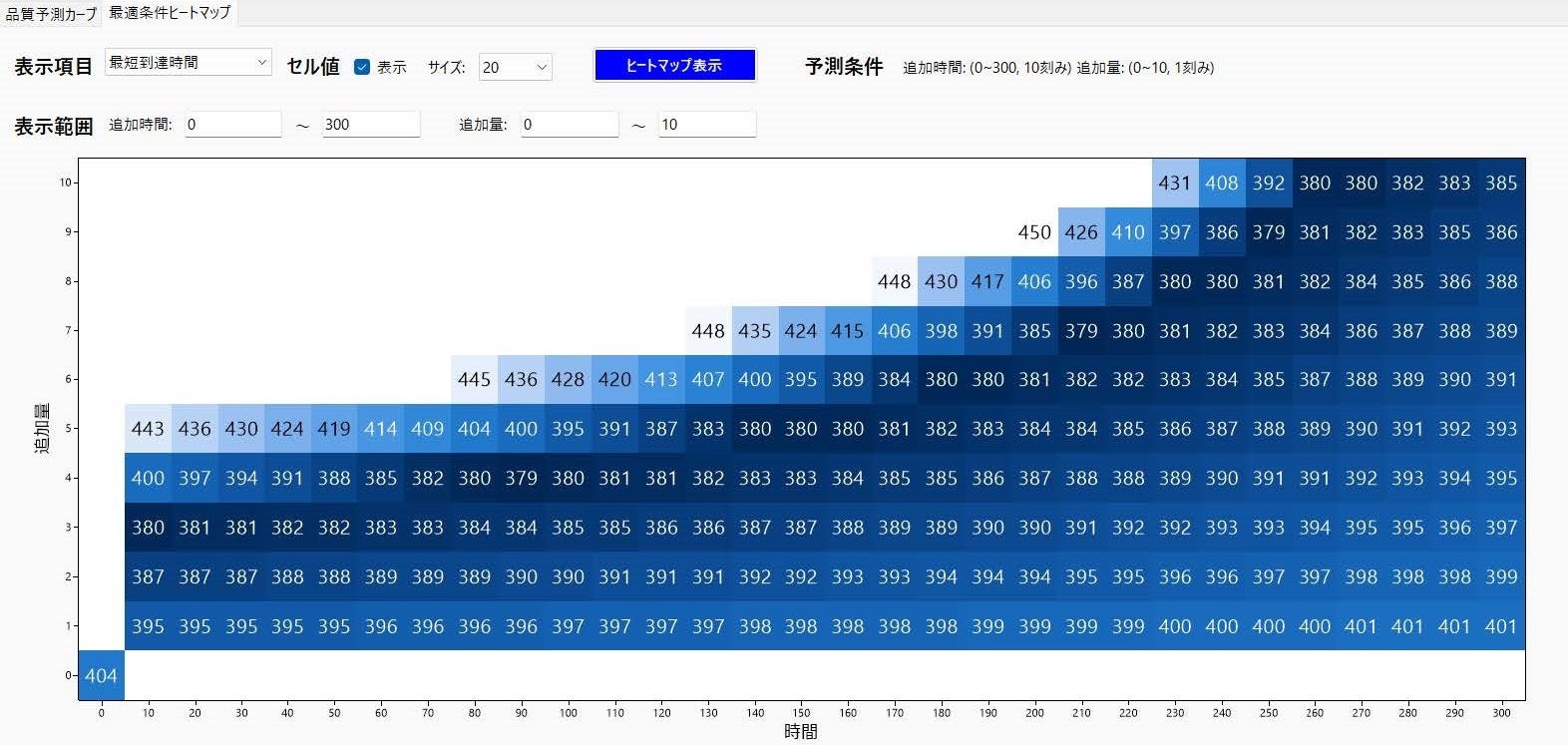 製造時の追加原料量(縦軸)と追加タイミング(横軸)の組合せにより、製品品質が所定の値に到達するための最短運転時間の予測結果を可視化。これにより、作業員は現状の予測結果から高い効果を見込める運転操作を選択可能です。また、色の濃淡は運転時間の差を表し、濃いほど短い時間となります。