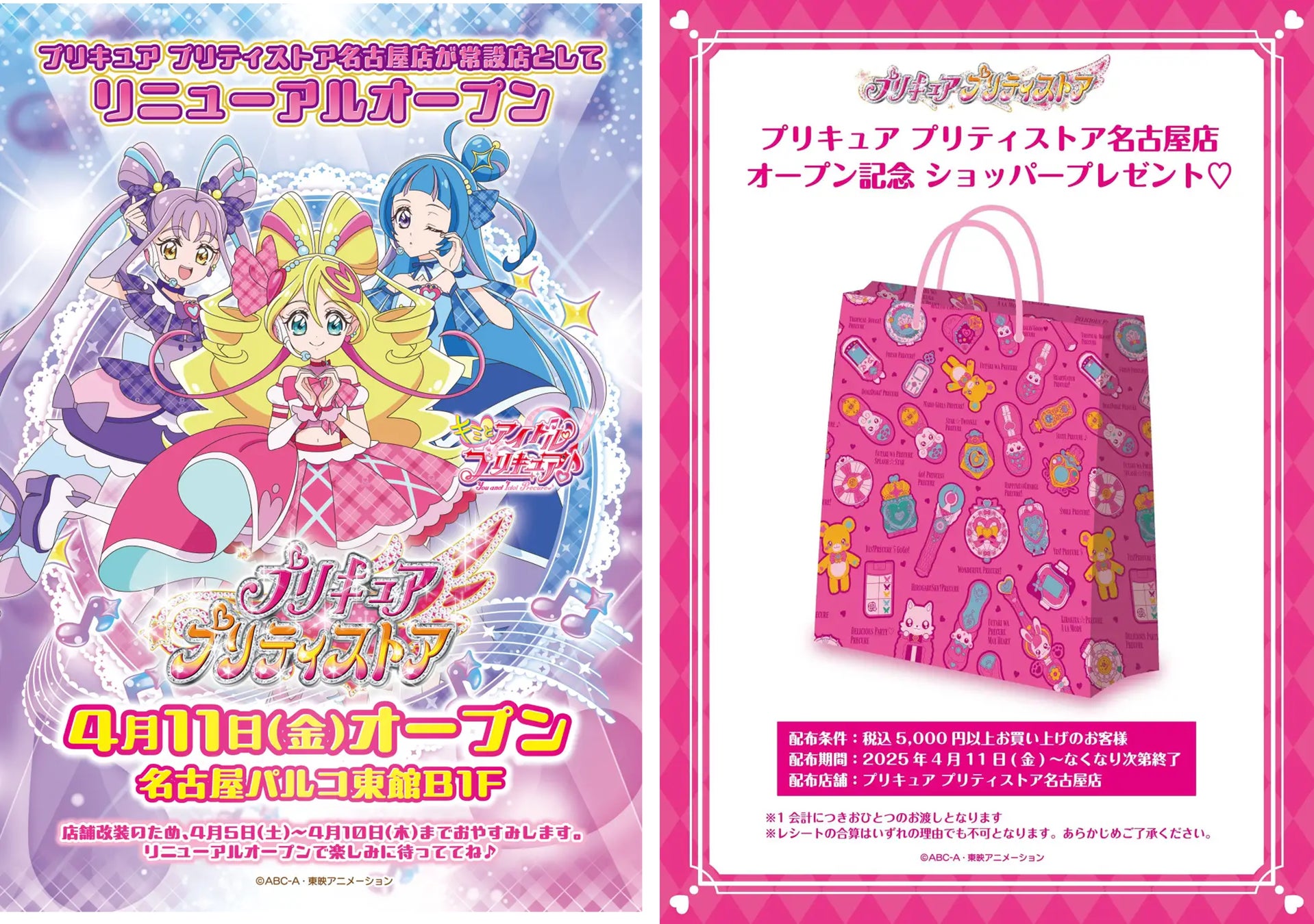 「プリキュア プリティストア名古屋店」リニューアルオープンを記念し、5,000 円(税込)以上お買い上げのお客様にショッパーをプレゼントいたします。