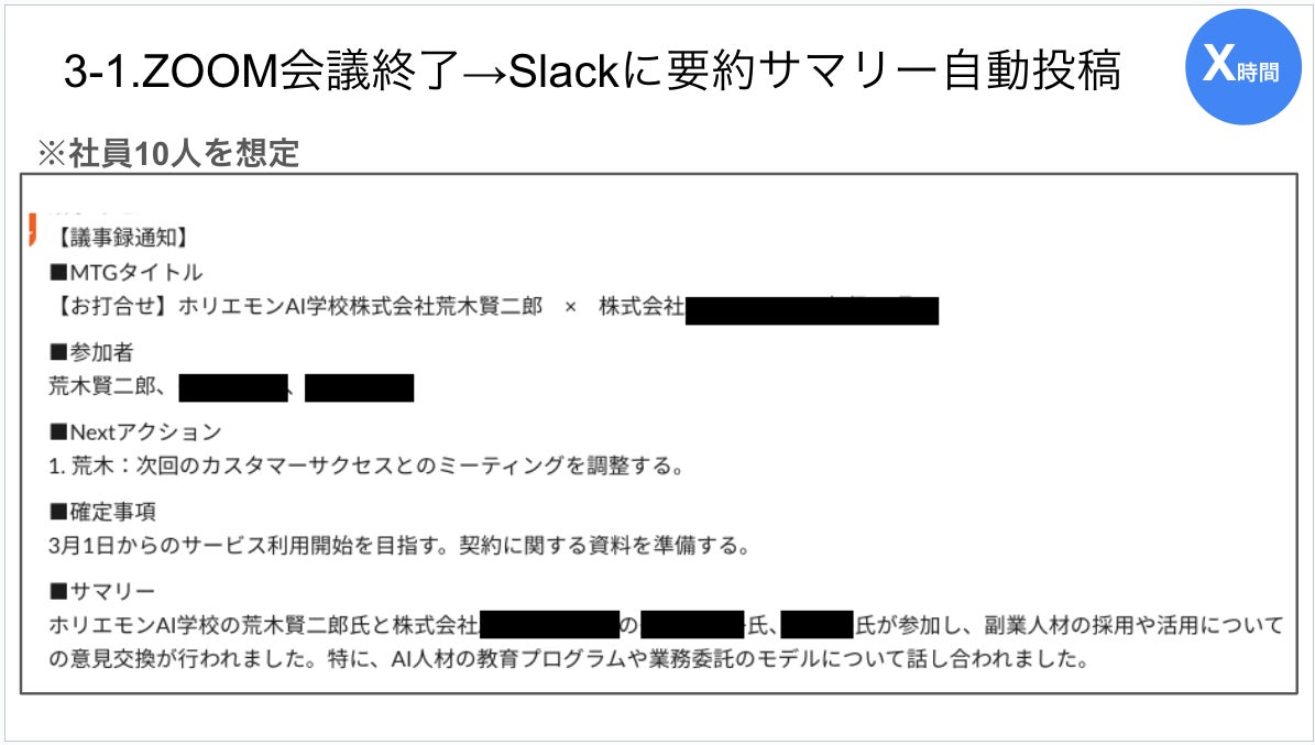 オンライン会議終了時に、AIが自動で議事録を文字起こし、全文を日付別のクラウドストレージに保存した上で、200文字の議事録要約を社内チャットツールへ投稿。一連の作業をオンライン会議終了ボタン押下と同時に自動で行われるように設定。