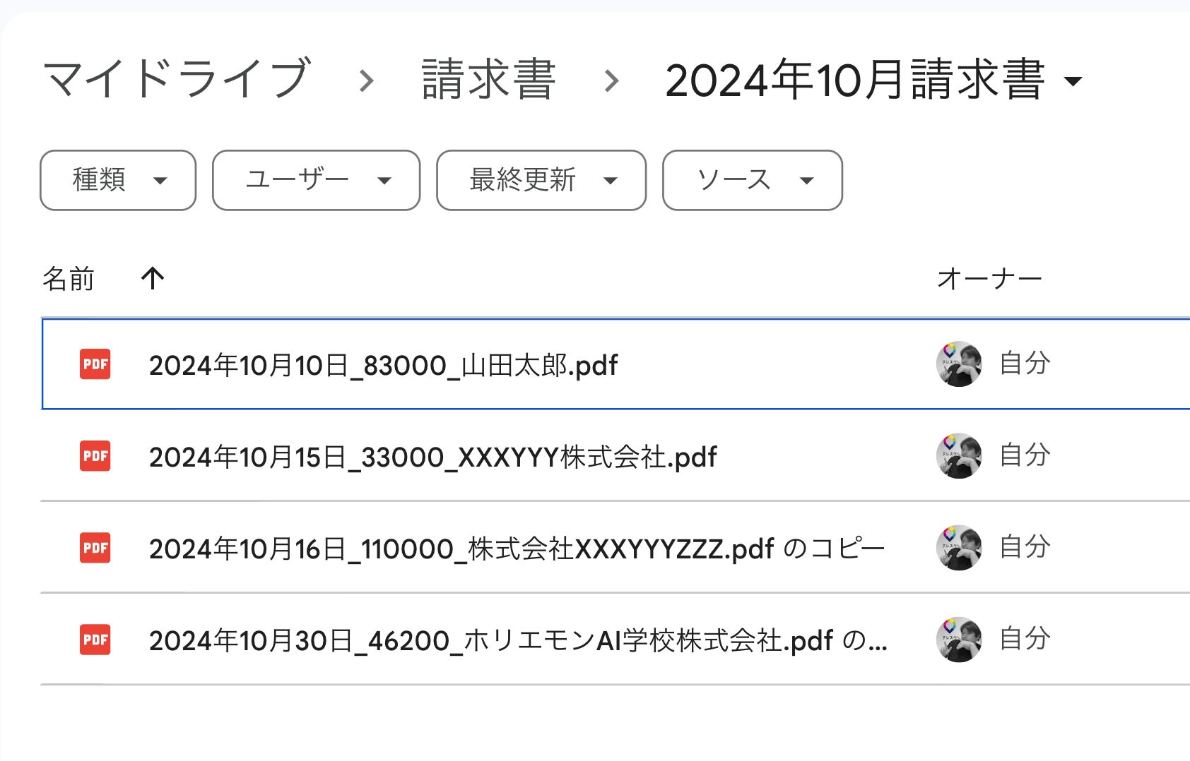 メールで届いた添付ファイルの請求書をAIが読み込み、添付されたファイル名をダウンロード、ファイル名を“請求元社名_支払日_請求金額.pdf”にリネームして月別のクラウドストレージに保存、会計ソフトに取り込み。一連の作業をメール受信と同時に自動で行われるように設定。