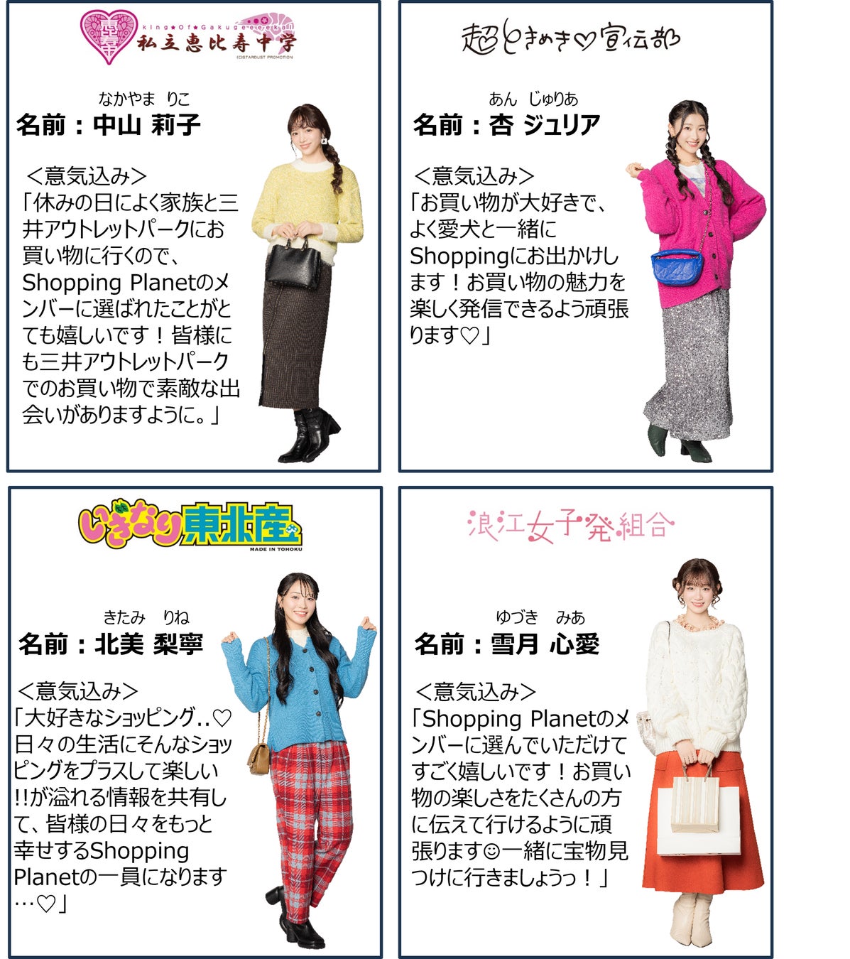 スタプラ超お買い物♡同好会として参加するのは、『私立恵比寿中学』中山莉子さん、『超ときめき♡宣伝部』杏ジュリアさん、 『いぎなり東北産』北美梨寧さん、『浪江女子発組合』雪月心愛さんの4名。普段別々のグループとして活動するアイドル4名が三井アウトレットパークを盛り上げるために初のコラボレーションに挑戦。制作したオリジナル楽曲は、三井アウトレットパーク 関東5施設(木更津・入間・幕張・多摩南大沢・横浜ベイサイド)それぞれのイメージをもとに制作され、各施設の館内放送でお楽しみいただけます。