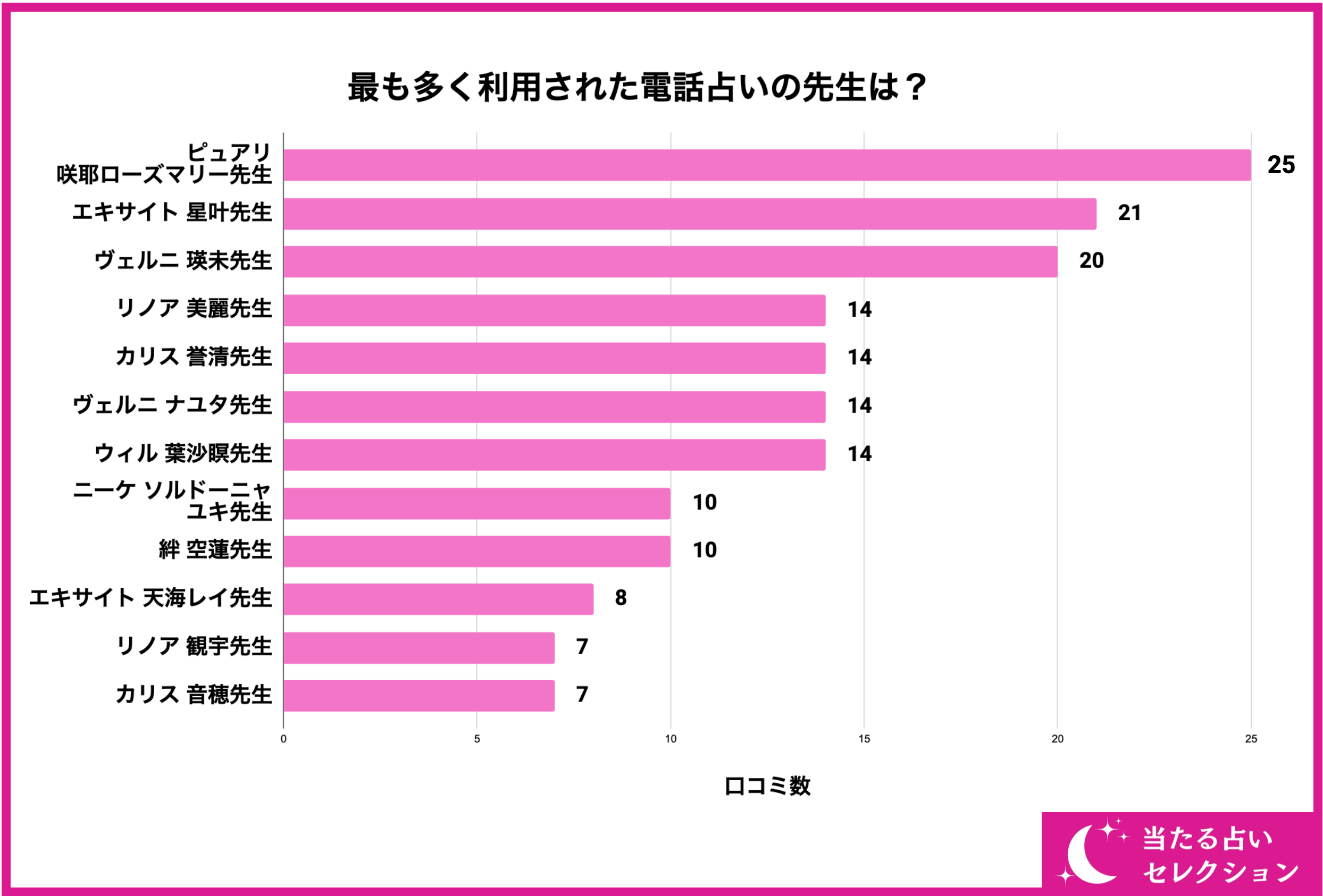 続いて、164名の利用者のうち最も多く利用された電話占いの先生をご紹介していきます。結論から言うと、『ピュアリ 咲耶ローズマリー先生』や『エキサイト 星叶先生』、『ヴェルニ 瑛未先生』といった有名な先生が上位となりました。やはり人気の先生は色々な記事や特集で見ることも多く、認知度や知名度が高いため、利用者数も多くなっています。さらに、大手の電話占いほど初回特典やキャンペーンなども豊富で、お得に占ってもらいやすいことも人気の理由と言えるでしょう。