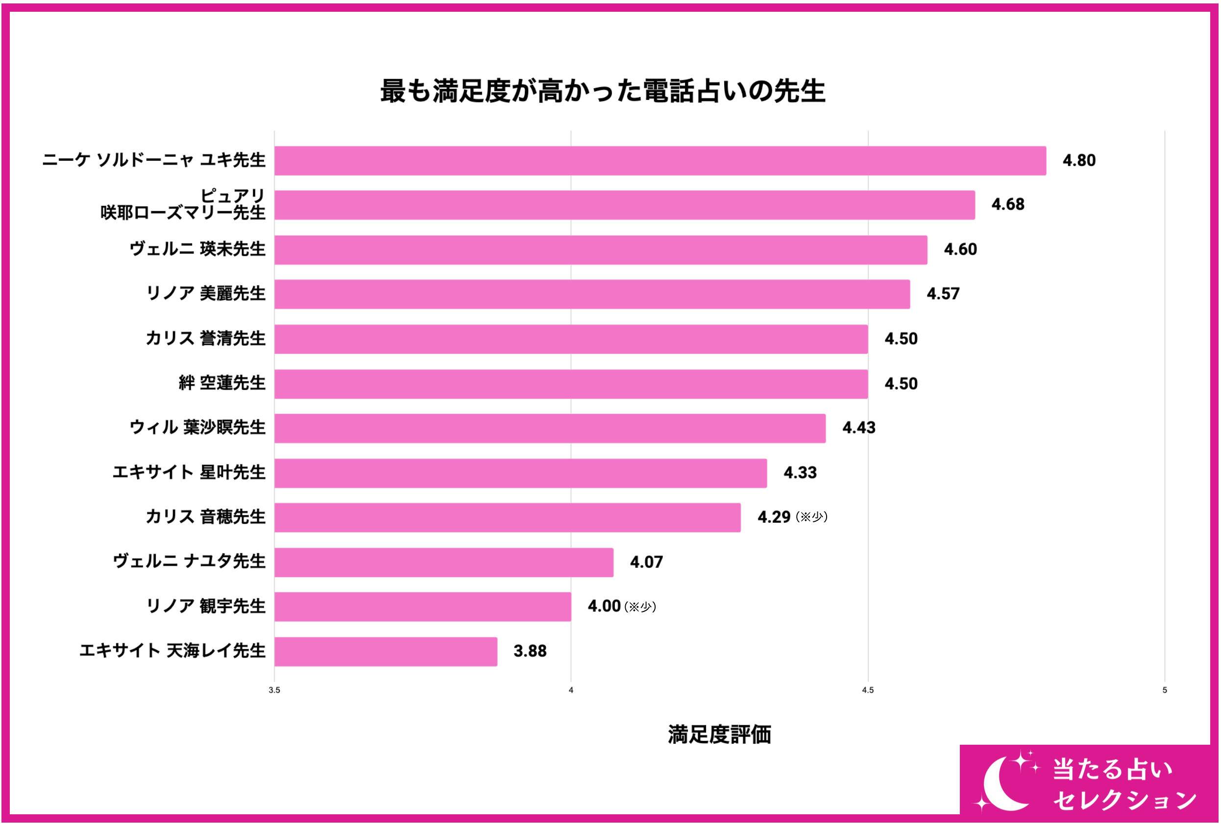 続いて、多くの電話占いの先生の中で最も満足度評価が高かったのはどの先生なのでしょうか?結論から言うと、画像の通り「ニーケ ソルドーニャ ユキ先生」が満足度評価「4.80/5.00」で最も評価が高いことが分かりました。第2位は『ピュアリ 咲耶ローズマリー先生』、第3位には『ヴェルニ 瑛未先生』がランクインする結果となりました。