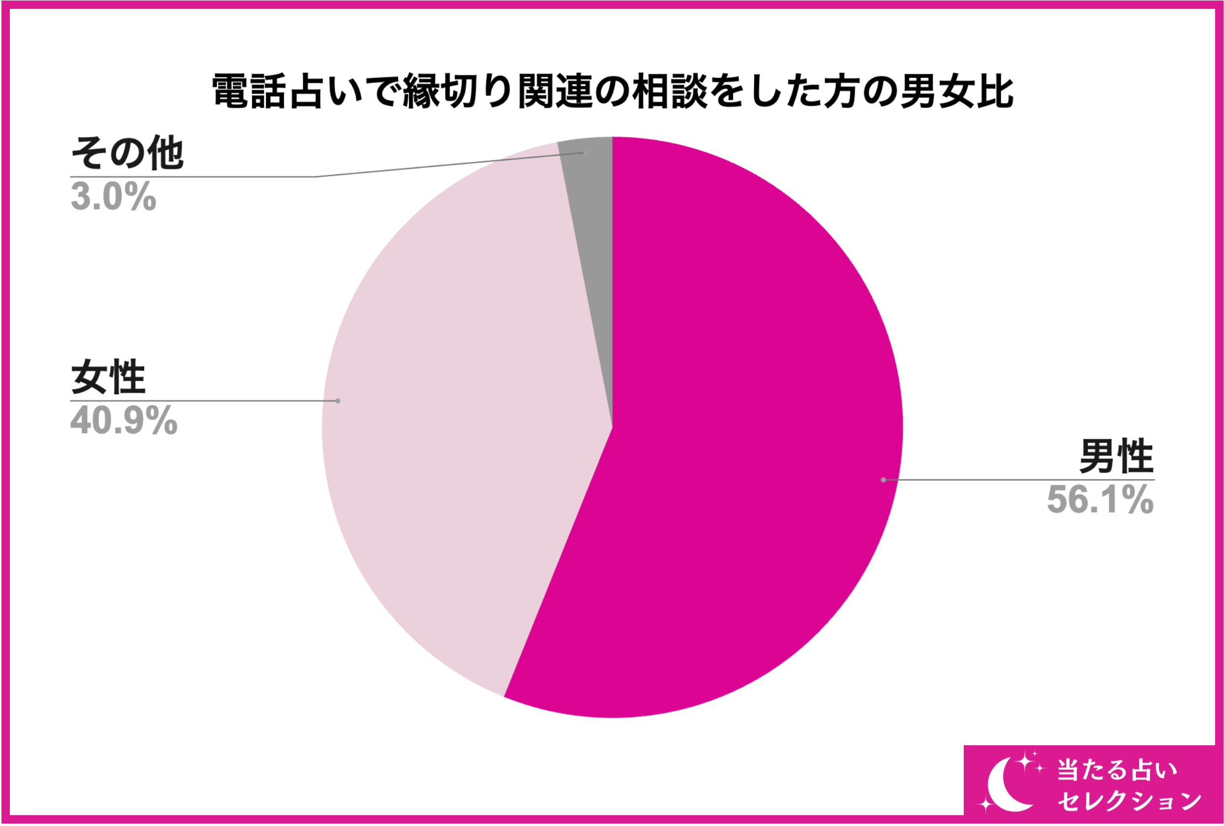 まず初めに、電話占いで縁切り関連を相談する方の男女比についてご紹介していきます。電話占いで縁切り関連を相談する男女の比率は画像の通り、男性が約56%、女性が約40%の結果となりました。電話占いで縁切り関連を相談する人は女性が多数というイメージがあるかもしれませんが、約56%(半分以上)が男性という結果になりました。