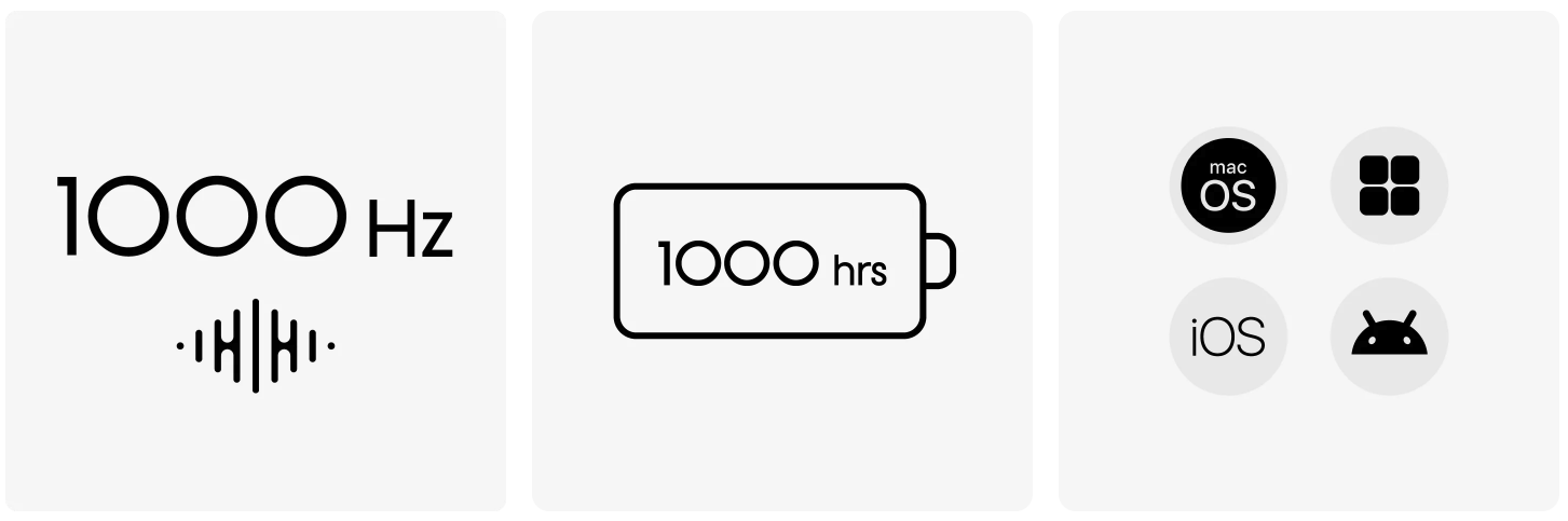 接続方式は、有線USB-C、Bluetooth 5.0、2.4GHz無線の3モードに対応しています。有線USB-Cおよび2.4GHz無線接続時には1,000Hzのポーリングレートを実現し、スムーズで安定した使用感を提供します。なお、本製品は技適認証を取得しており、日本国内でも安心してご利用いただけます。
