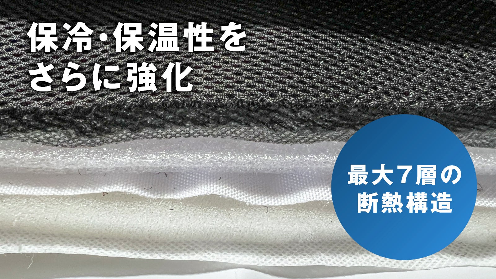 ② 最大7層の断熱構造 背中部分※には7層の断熱材(ポリエチレン系断熱フォーム)を重ね、冷気を長時間キープ。内装はEVA樹脂で防水仕様のため、水拭きも可能です。※部分によって使用されている素材の枚数が異なります(2枚〜7枚)