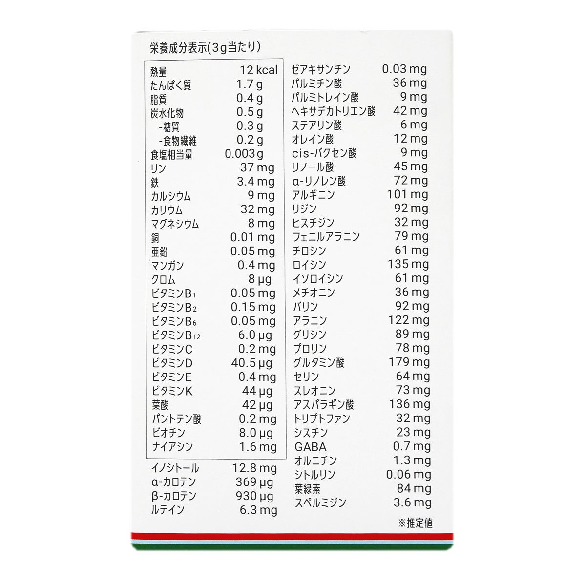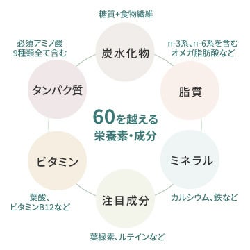 プラントベースホールフードであるクロレラは、約60%が植物性タンパク質。ビタミン、ミネラルのほか、女性に嬉しい葉酸や食物繊維など60を超える栄養素・成分を含有します。アレルギー原材料28品目は不使用で、お子様や妊婦さん、シニアなど幅広い年代の方に安心してご飲用いただけます。