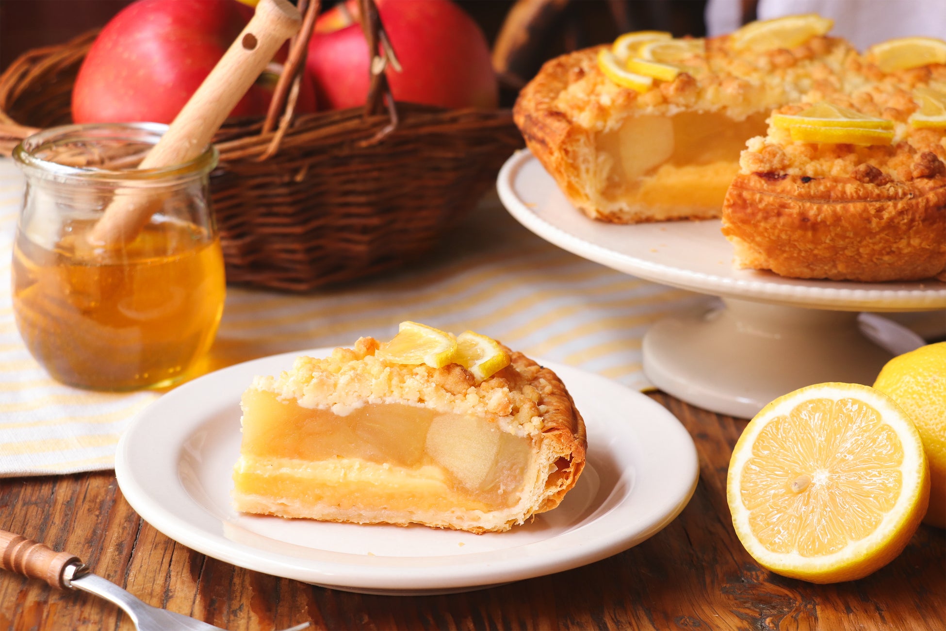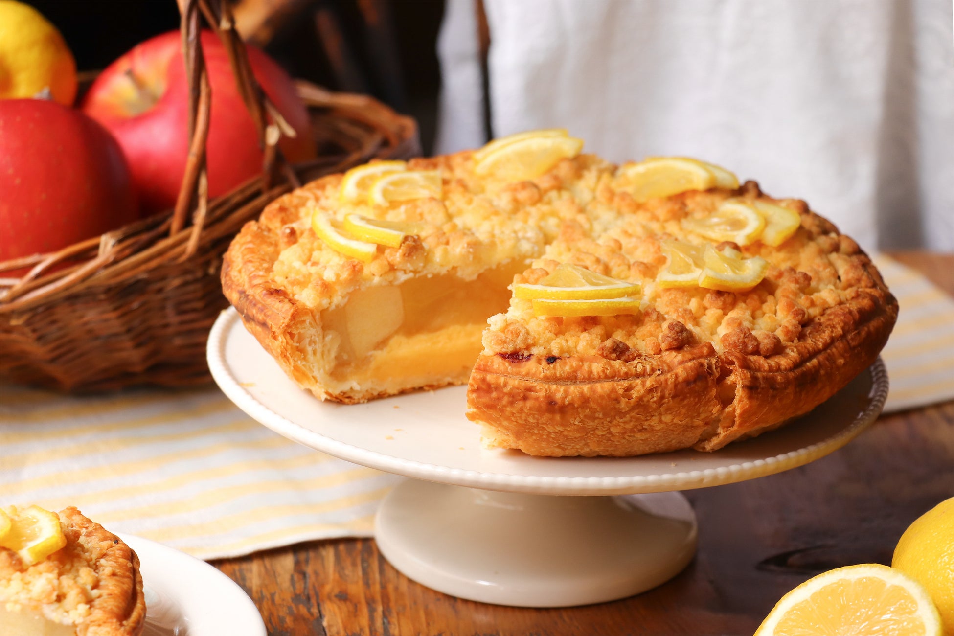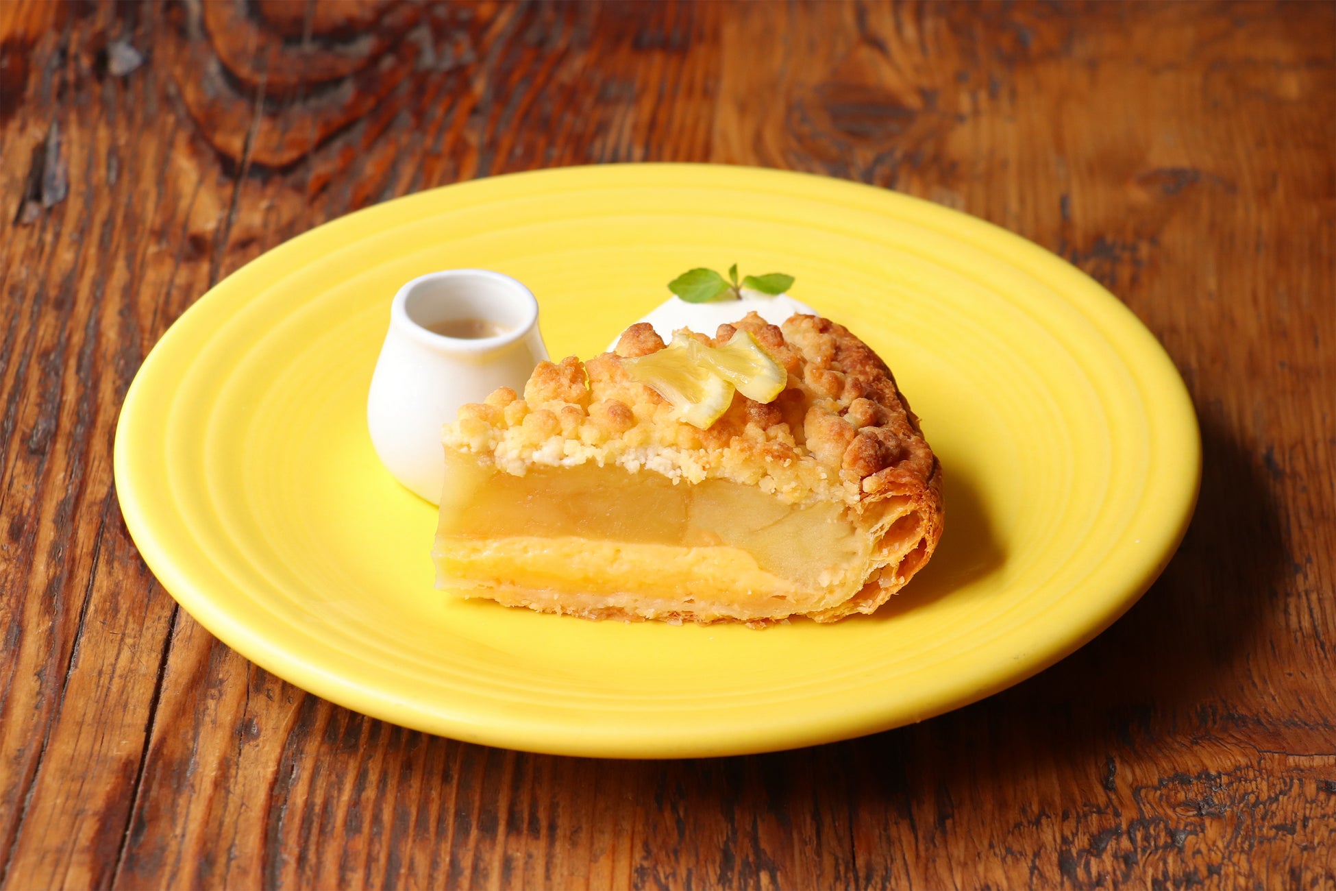 自家製のレモンカードとカスタードクリームに、たっぷりのりんごを重ねて焼き上げた、爽やかな味わいの季節限定アップルパイ。