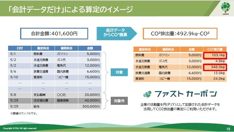 ディエスジャパンが提供しているのは、会計データから簡単にCO2排出量を算出できるツール「ファストカーボン」です。これは脱炭素という重要な取り組みを、世の中の誰にとっても身近なものにするという概念を持っています。ファストフードやファストファッションのように、気軽にカーボン問題に取り組んでいこうという提案です。このツールは、OZCaFの公認ツールとしても採用されています。(※1)
