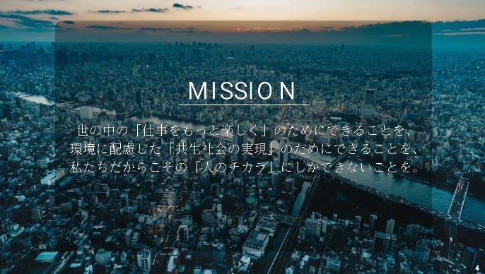 ディエスジャパンのミッションは『世の中の「仕事をもっと楽しく」のためにできることを、環境に配慮した「共生社会の実現」のためにできることを、私たちだからこその「人のチカラ」にしかできないことを。』です。