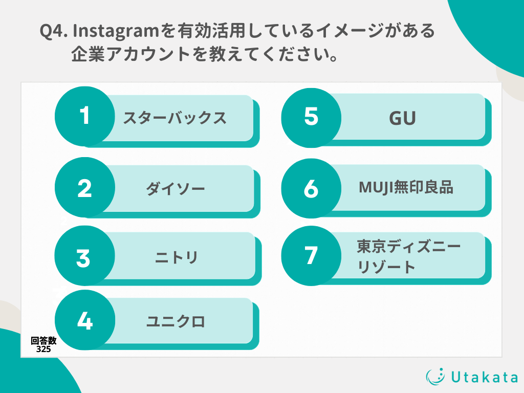 「Instagramを有効活用しているイメージがある企業アカウントを教えてください。」と質問したところ、「スターバックス」が15票、「ダイソー」が14票、「ニトリ」が10票、「ユニクロ」が9票という回答となりました。