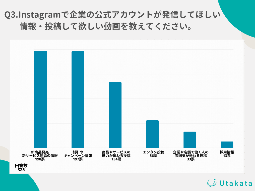 「Instagramで企業の公式アカウントが発信してほしい情報・投稿を教えてください。」と質問したところ、「新商品発売・新サービス開始の情報」が198票、「割引やキャンペーン情報」が197票、「商品やサービスの魅力が伝わる投稿」が134票、「エンタメ投稿」が56票という回答となりました。