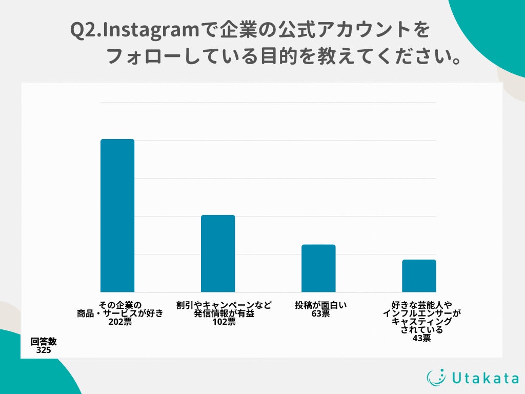 「Instagramで企業の公式アカウントをフォローしている目的を教えてください。」と質問したところ、「その企業の商品・サービスが好き」が202票、「割引やキャンペーンなど発信情報が有益」が102票、「投稿が面白い」が63票、「好きな芸能人やインフルエンサーがキャスティングされている」が43票という回答となりました。