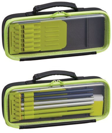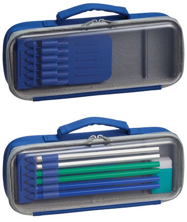 ふた部分が軽くて丈夫な透明PET素材で出来ていて中に入れたものが外から見えるので、忘れ物チェックが簡単になり、整理整頓の習慣が身につきやすくなる効果が期待できます。お気に入りの文房具との”中身見せコーデ”を楽しむことができます。ペンホルダーには、太軸三角かきかた鉛筆も入ります。カラーは、ブラック、ネイビー、グリーンの3色。