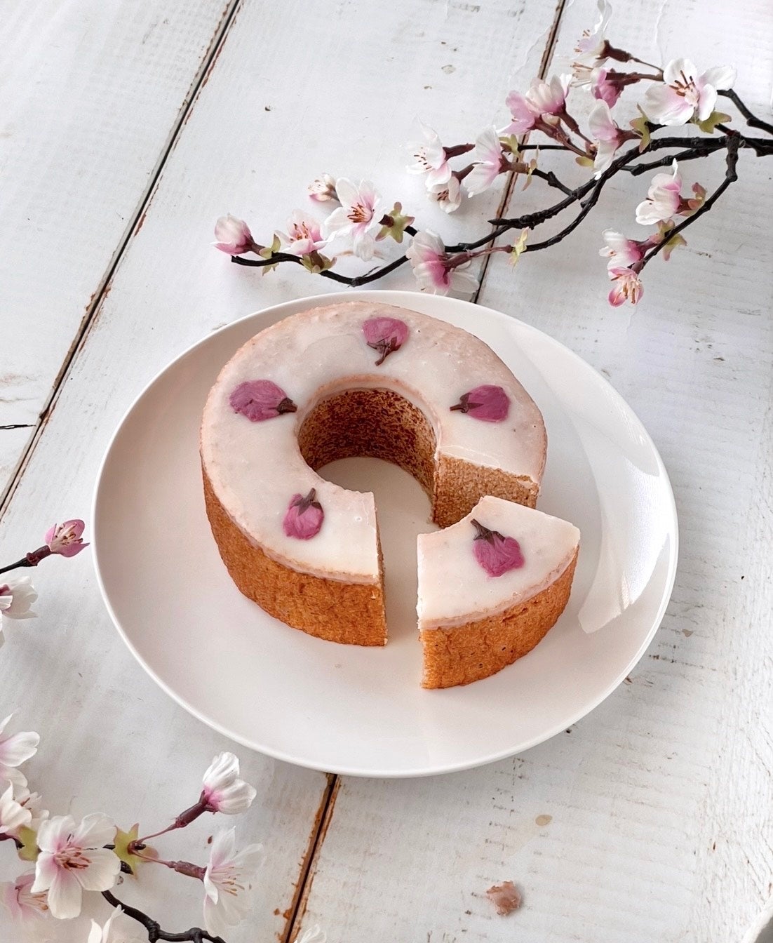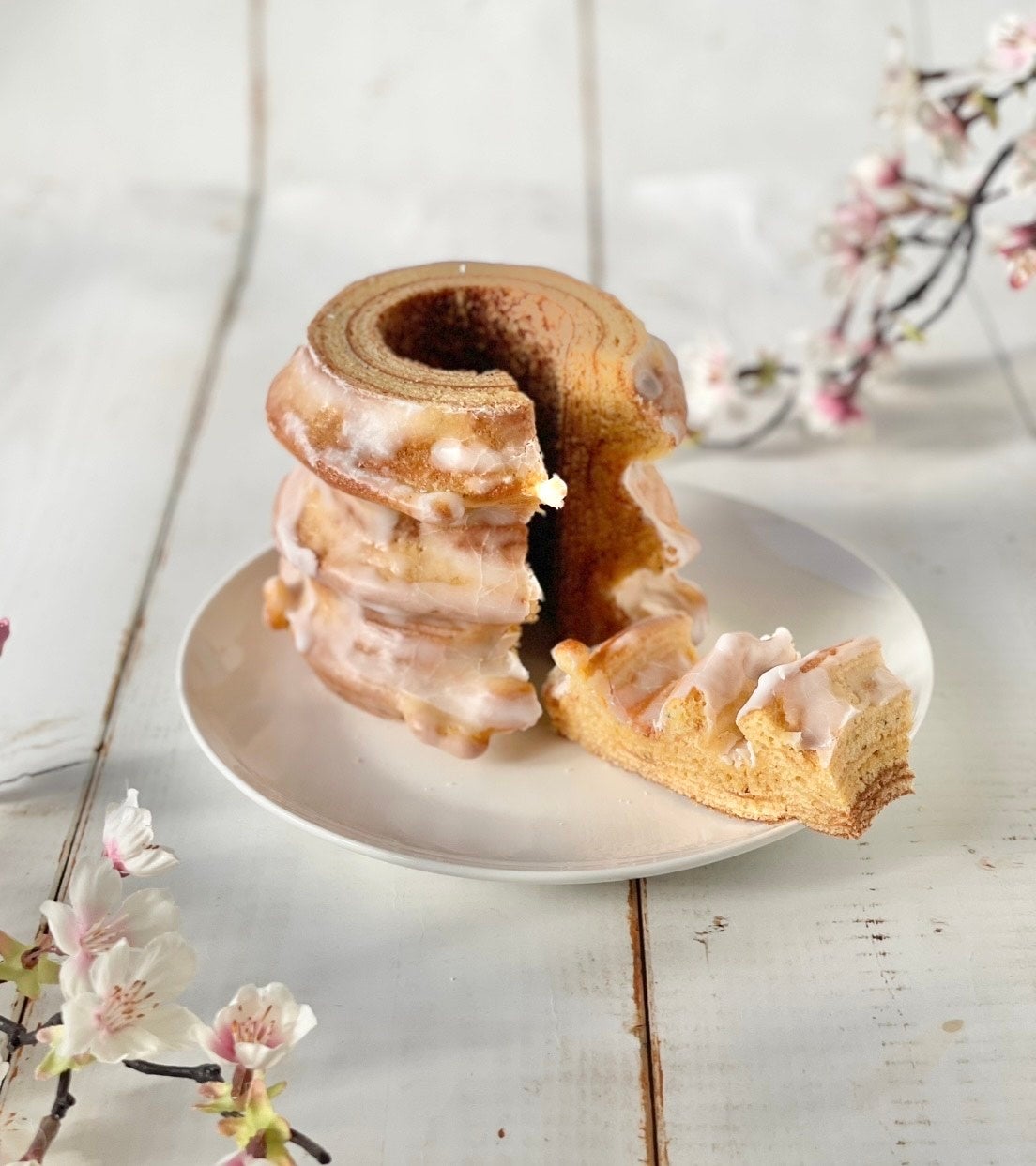 表面には桜のシロップを染み込ませて桜の風味豊かなホワイトチョコレートでコーティングしました。桜の花の塩漬けをトッピングし、見た目も華やかな仕上がりがとても可愛らしいバウムクーヘンです。
