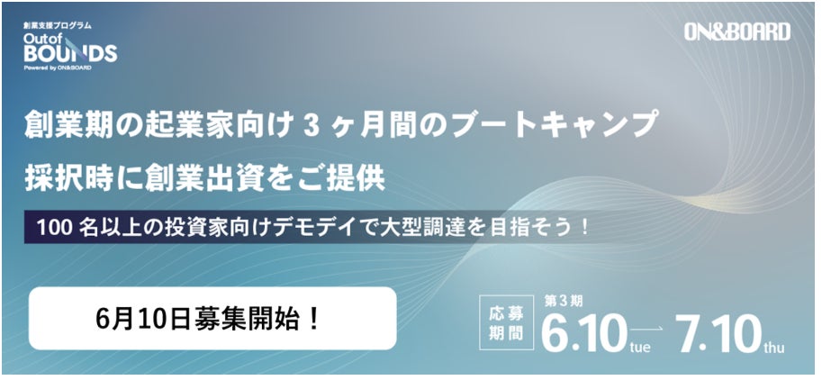 ON&BOARD株式会社(所在地:東京都港区虎ノ門、代表取締役:下平将人、中山航介 以下「当社」)は、来る6月10日(火)より、創業支援プログラム・第3期「Out of BOUNDS」の参加者の募集を開始することをお知らせいたします。