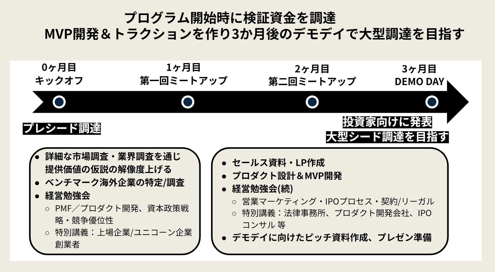 採択時にON&BOARDが出資をコミット。3ヶ月のブートキャンプを経て、100名以上の投資家の前でデモデイを実施し、大型調達を目指そう!