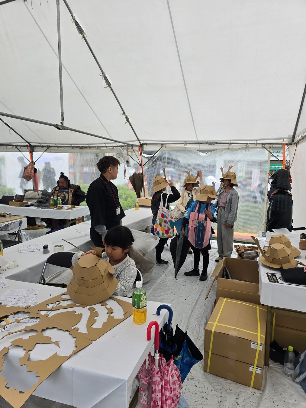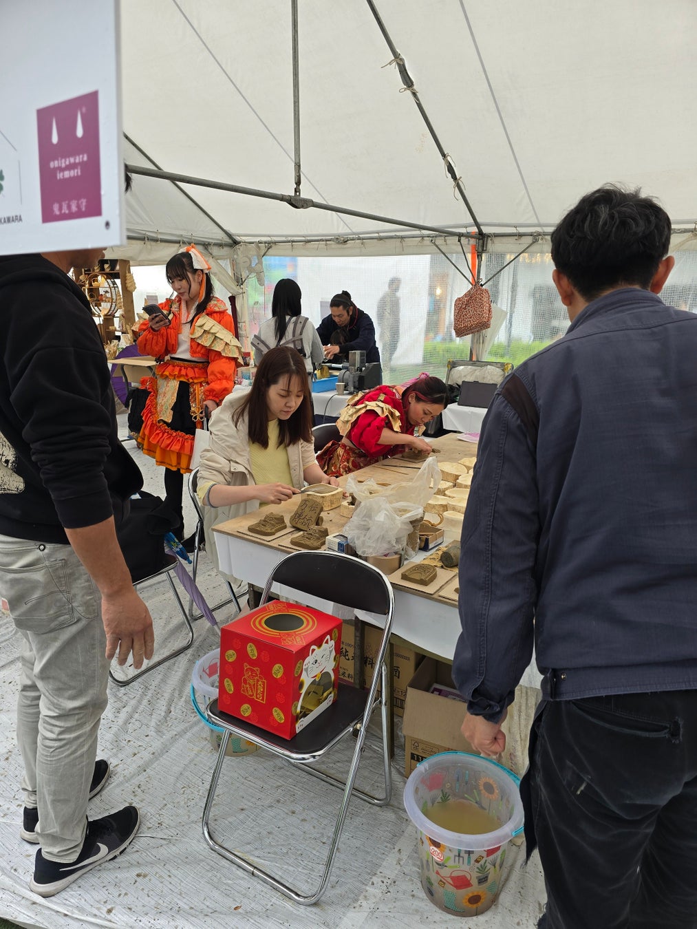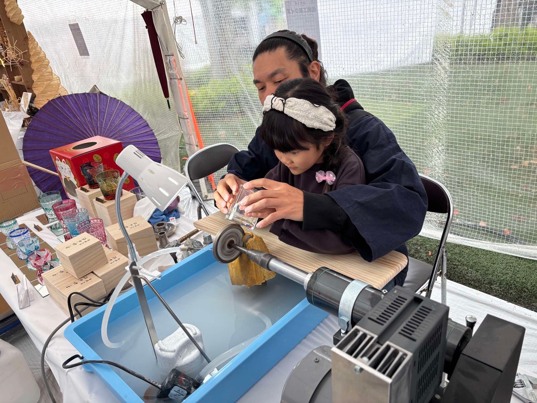 さらには、火縄銃展示、ダンボールで兜を作るワークショップ、型に素材をはめて作るキャラクターの瓦作り、グラスにひとつずつ紋様をつけて世界にひとつだけの作品をつくる江戸切子体験、麦わらで作る繊細な作品を親子一緒になって作る麦わらの編み細工体験、小さなお子さまから親御さんまでが楽しまれていた粘土陶芸体験、墨で模様を作ったあとに生地に転写される色鮮やかなハンカチ墨流し染め体験に加えて、おつけもの処[京都 丸漬] のお漬物が食べられるなど、観る・体験する・食べるの五感で楽しめる日本の伝統文化体験がギュッと詰まった会場となりました。