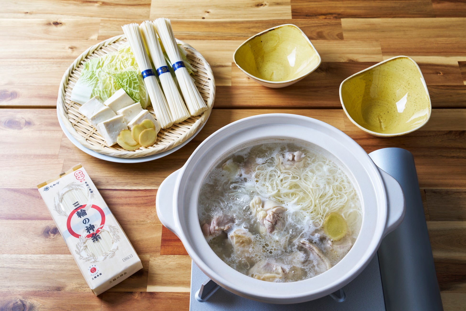 イタリア直輸入のエキストラバージンオリーブオイルを使用し本腰熟成製法でつくられた三輪素麺『三輪の神糸』を販売する株式会社マル勝髙田商店(本社:奈良県桜井市、代表:髙田 勝一)は、「パントリーのお守りPROJECT」第二弾レシピを公開しました。「はじめから素麺で味付けする水炊き生姜鍋」など素麺の新しい調理テクニック満載のレシピをぜひお楽しみください。