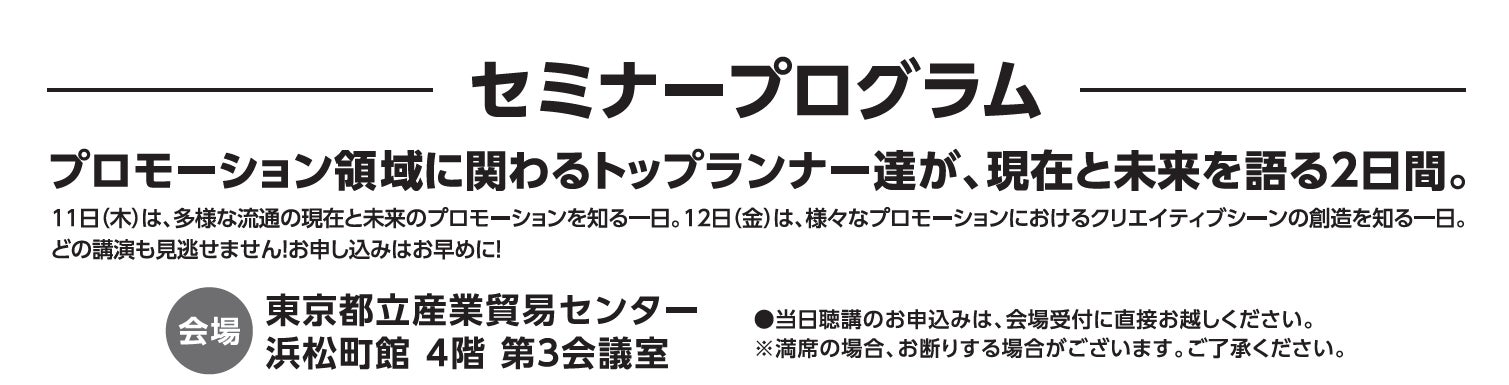 ■協賛:公益社団法人 日本アドバタイザーズ協会/一般社団法人 日本印刷産業連合会/一般社団法人 日本広告業協会/公益社団法人 日本サインデザイン協会/一般社団法人 全国スーパーマーケット協会/一般社団法人 日本ディスプレイ業団体連合会/一般社団法人 日本空間デザイン協会/公益社団法人 日本パッケージデザイン協会/公益社団法人 日本マーケティング協会/日本チェーンストア協会/特定非営利活動法人エムシーイーアイ/一般社団法人 ACC/日本プロモーショナル・マーケティング学会