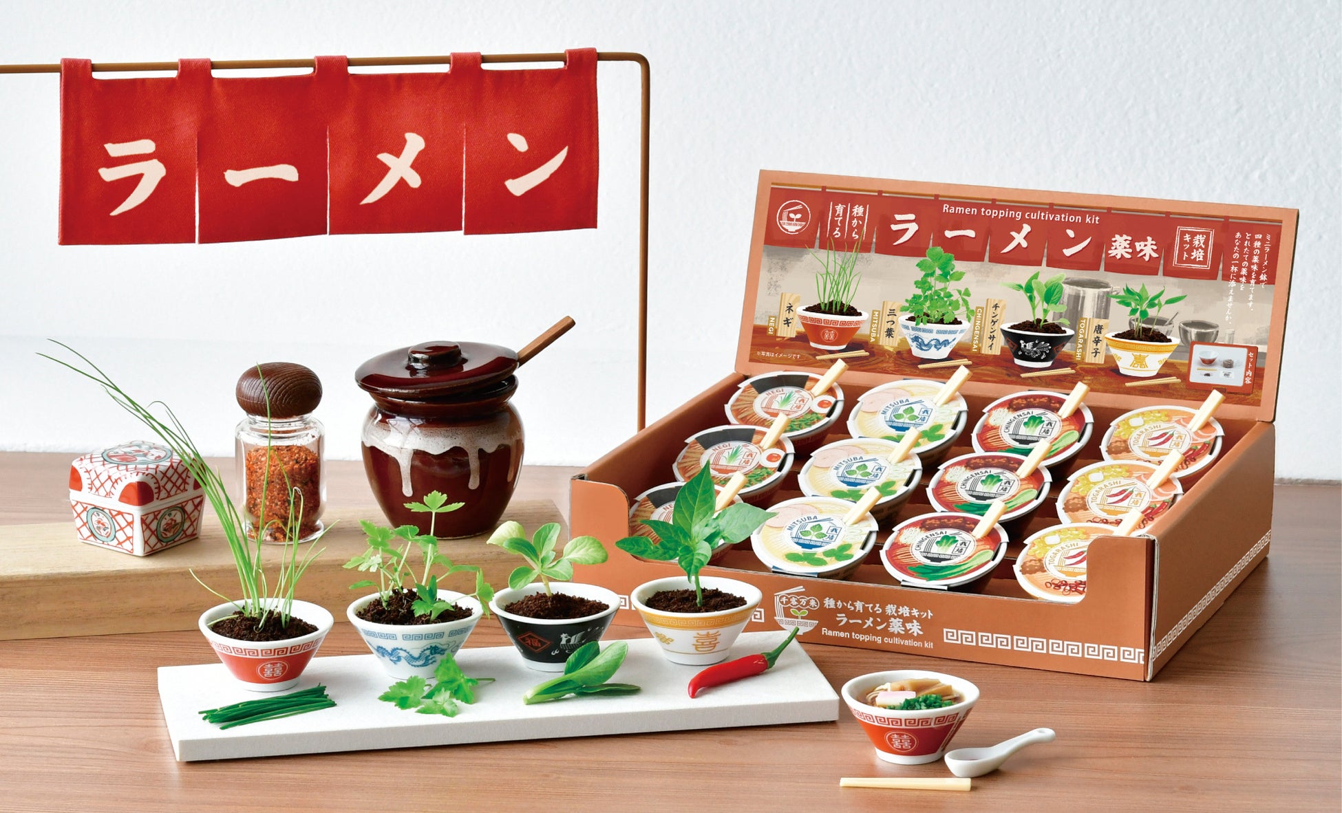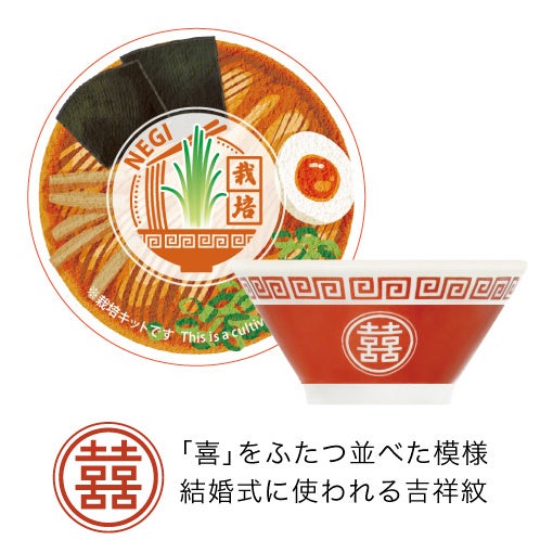 醤油ラーメンは、赤い昔ながらのラーメン鉢をモチーフにしたデザインで、ネギを育てる栽培キット。