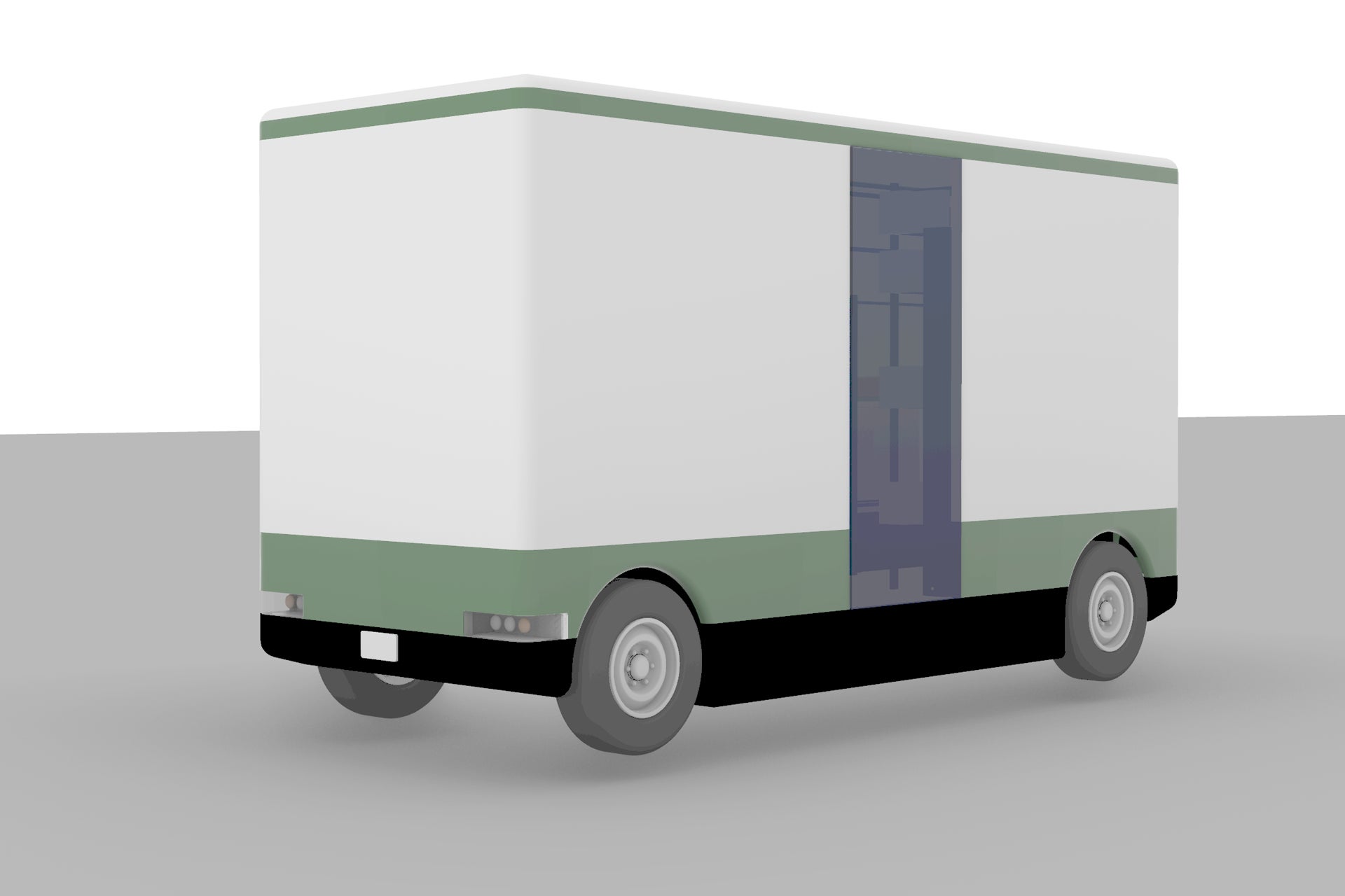 商用バン相当のサイズの自動走行車両(四輪)です。一般車両と同程度の速度で車道を走行し、配送先まで移動します。配送先へ到着した後は、道路に面した受け取りポートに荷物を投入します。
