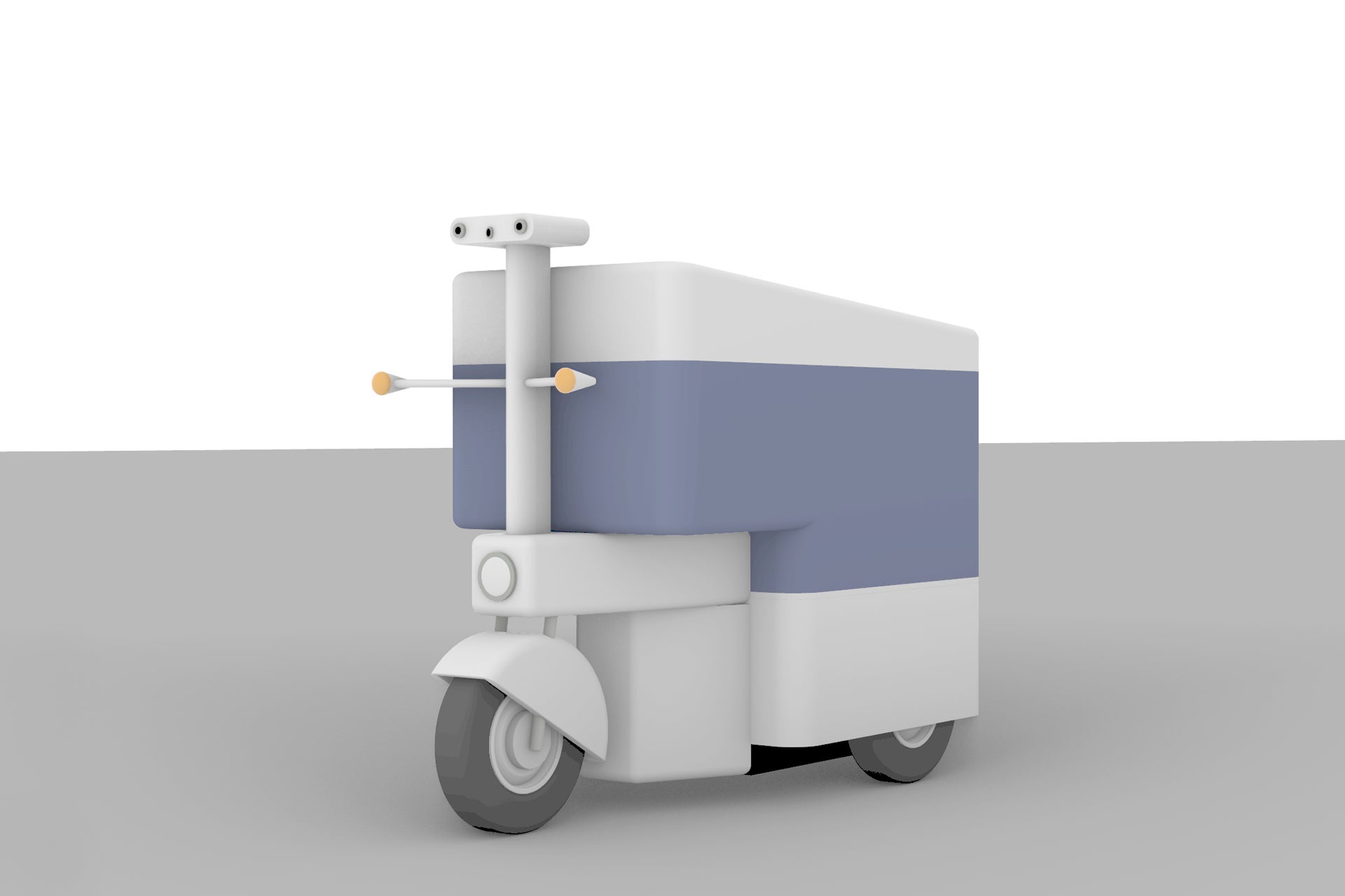 既存の原付相当のサイズ(横幅+100mm程度)の自動走行車両(三輪)です。一般車両と同程度の速度で車道を走行し、配送先まで移動します。配送先へ到着した後は、私有地内に設けられた受け取りポートに荷物を投入するほか、ユーザーに荷物を取り出してもらうことで配送を完了します。