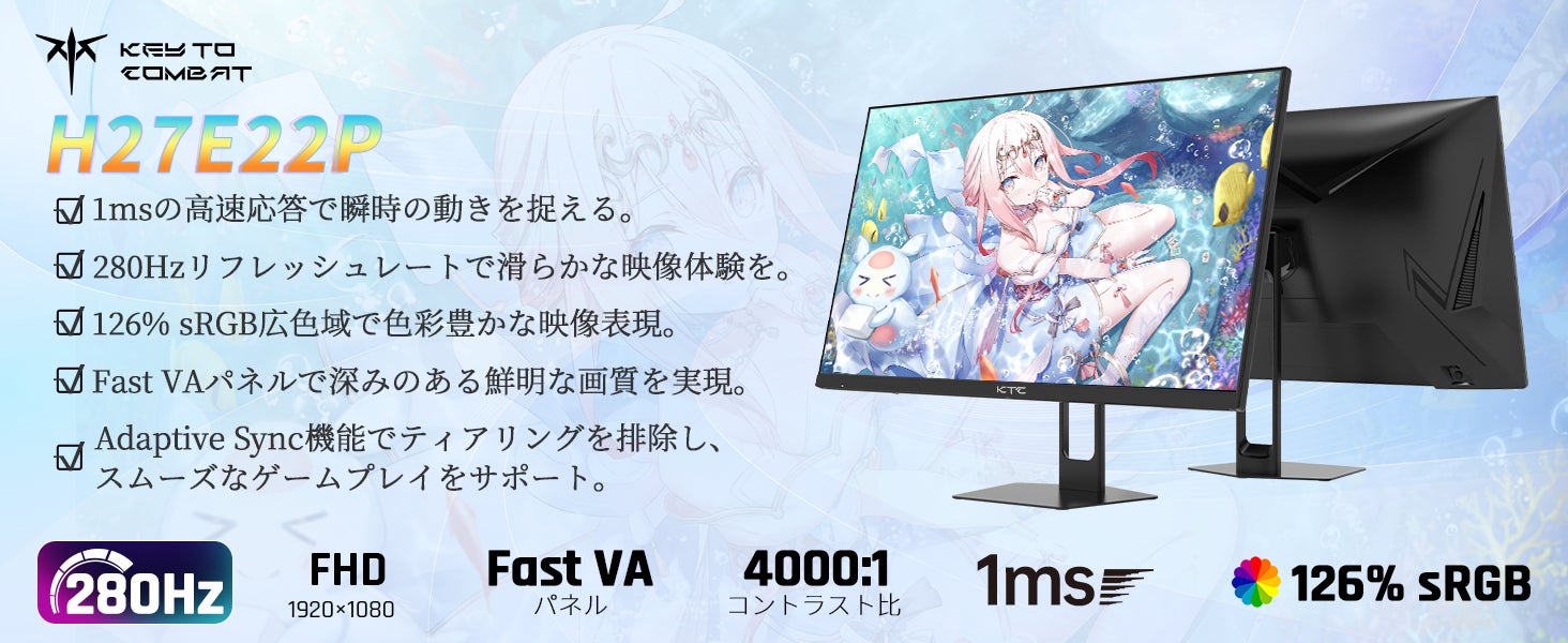 H27E22Pは、280Hzの高速リフレッシュレート、1ms応答速度を誇り、ゲーミングモニターとして理想的な一台です。さらに、低ブルーライト機能やVESA対応で、長時間の使用でも目に優しい設計です。5%オフコード「P4K28HFD」でお得に購入!