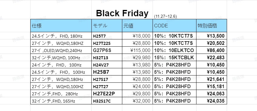 KTCの公式ストアでは、セール期間中に特別割引を実施中です。各製品には、専用の割引コード「10KTCT7S」「10ELKTCO」「P4K28HFD」などがあり、さらにお得に購入できます。セール期間は11月29日から12月5日まで。お早めにチェックして、最高のモニターをお得に手に入れましょう!