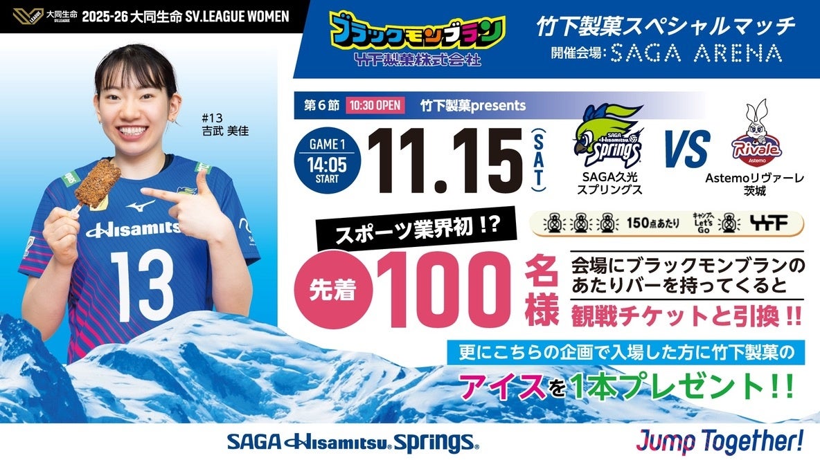 2025-26 大同生命SV.LEAGUE WOMEN 第6節 GAME1は「竹下製菓スペシャルマッチデー」としての開催が決定しました。開催に合わせて先着100名様限定、ブラックモンブラン・ミルクック・トラキチ君を食べて、「合計150点分」のあたりと観戦チケットが交換できるキャンペーンを実施いたします。