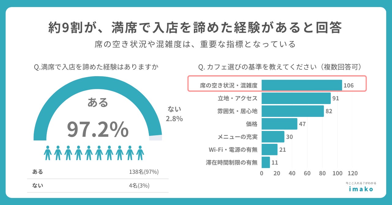 弊社で実施したアンケートによると、約9割が満席で入店を諦めた経験があると回答。空き状況や混雑度は、お店を探す上で重要な指標となっていることが明らかになりました。