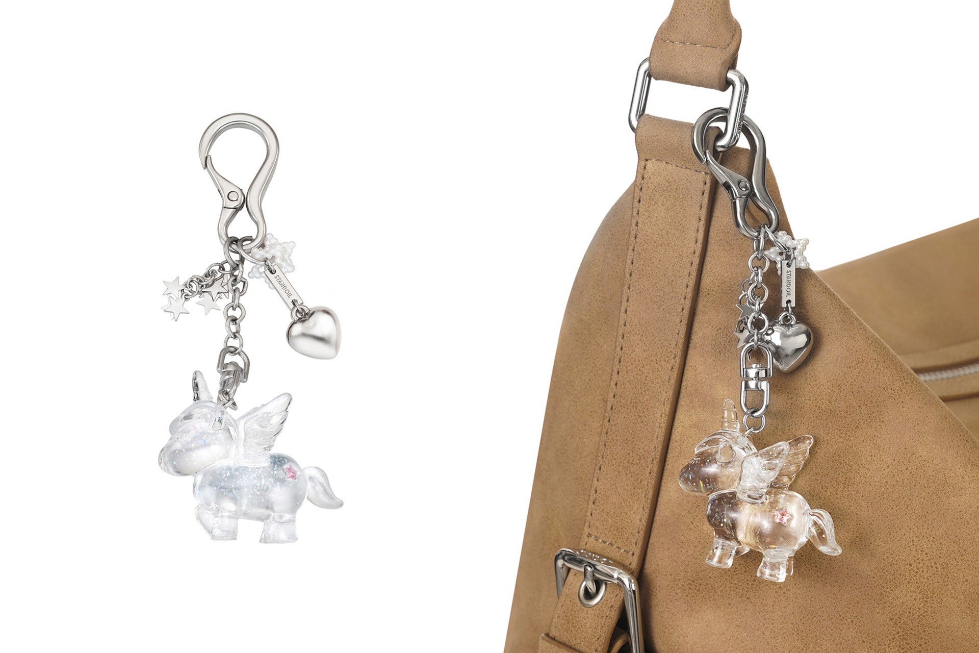 バッグにキーリングとして演出できる、星モチーフが印象的なサングラスホルダーです。