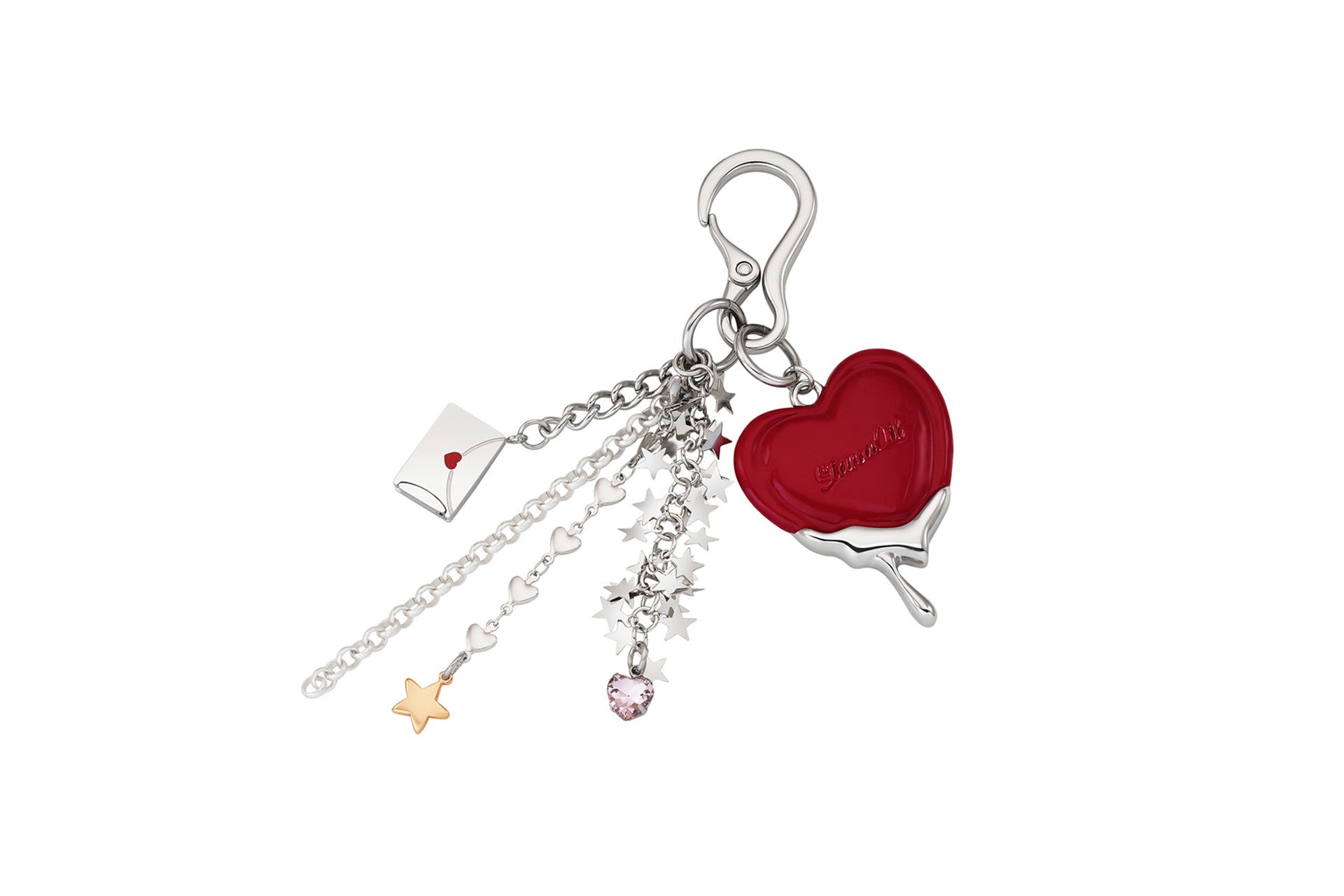 バレンタインシーズンにあわせ、日本限定で制作された「メルティングハートキーリング」は愛のメッセージを込めたハートとラブレターをモチーフに、星とハートのディテールチェーンがアクセントとなったデザインです。バッグに甘いポイントを添えるアイテムとなっております。