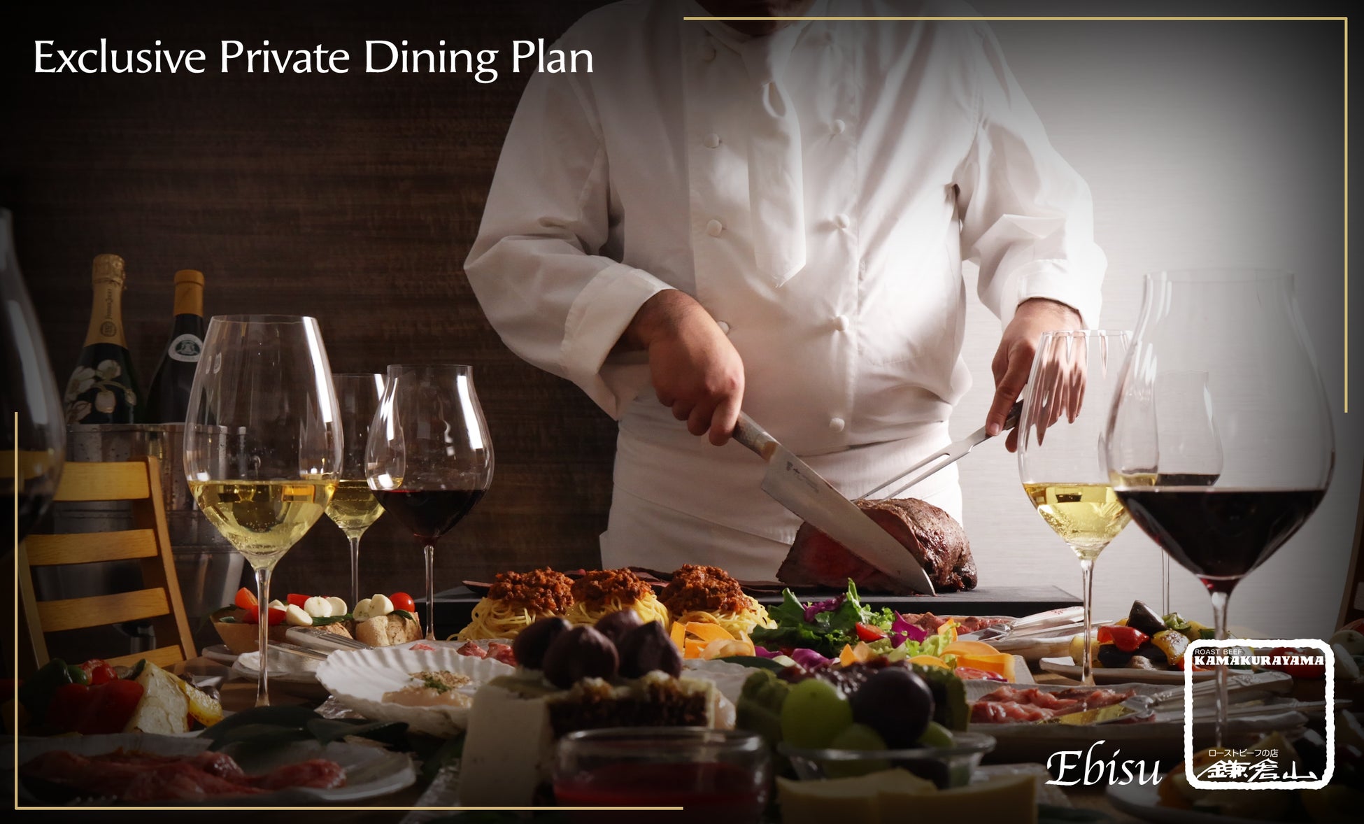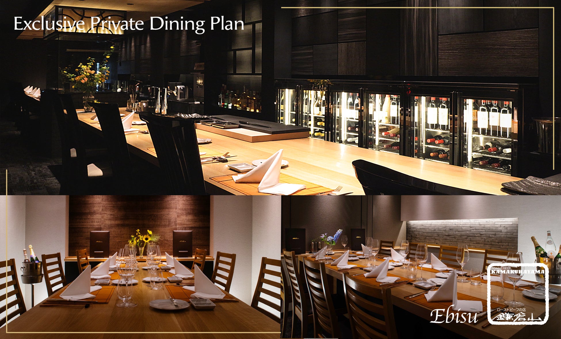 恵比寿駅から徒歩1分という好立地に位置する恵比寿店では、14名様以上のご予約で貸切無料となる贅沢なプランをご用意しました。シェフの技を目の前で楽しめるカウンター席や、プライベートな時間を満喫できるVIPルームなど、館内すべての空間を自由にご利用いただけます。