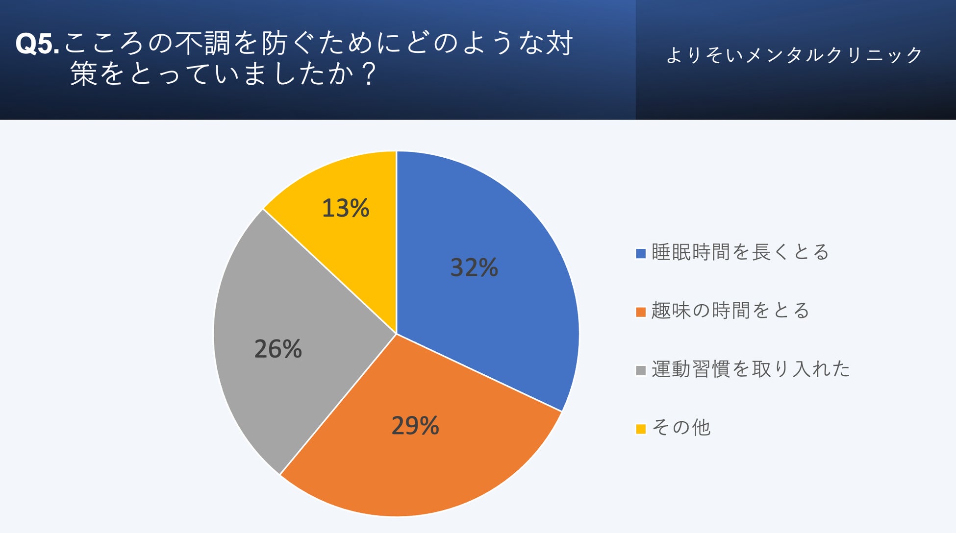その結果、「睡眠時間を長くとる」「趣味の時間をとる」などの対策をとっていることがわかりました。