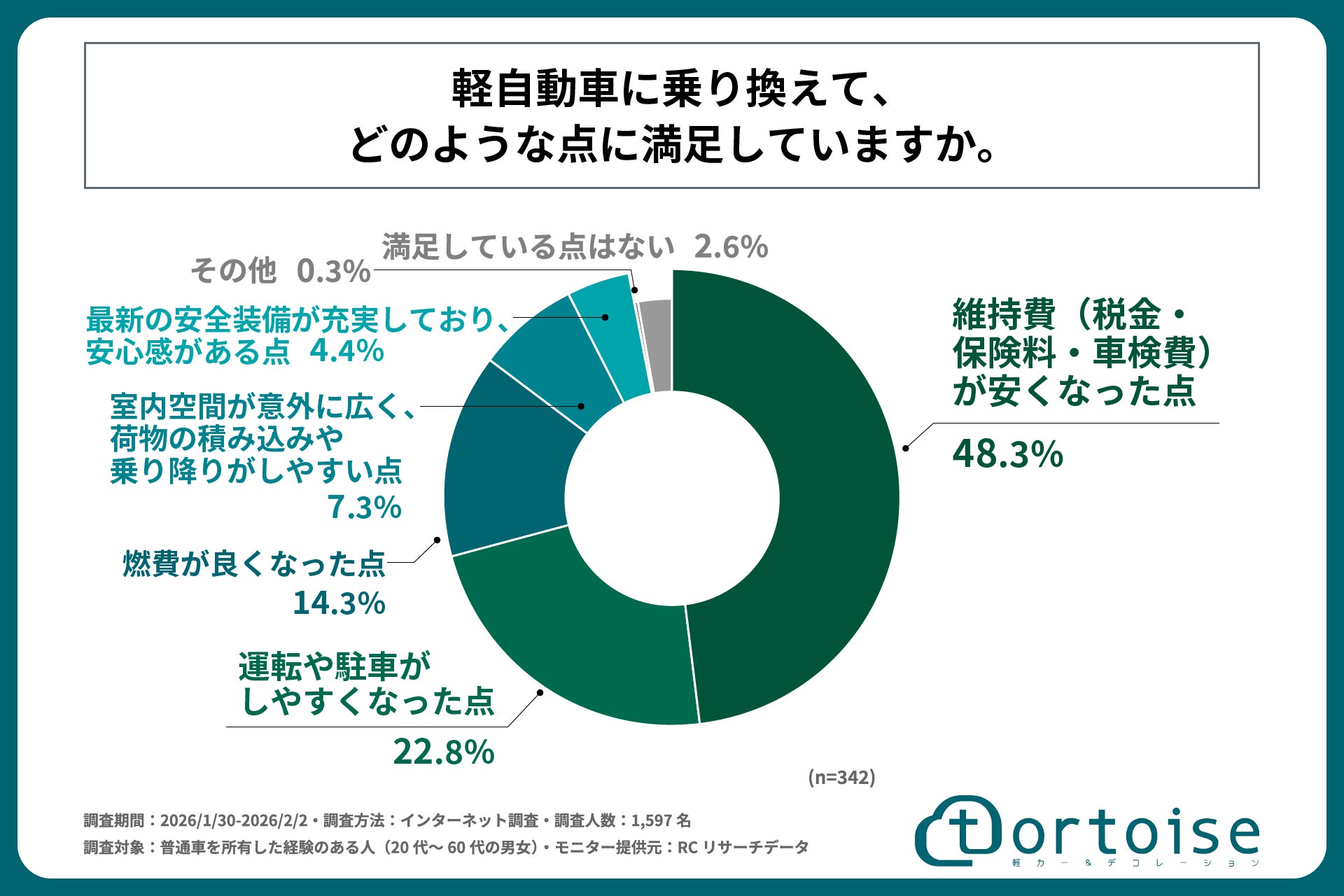 調査の最後、普通車から軽自動車へ乗り換えたと回答した人を対象に「軽自動車に乗り換えてどのような点に満足しているか」を尋ねる設問への回答では、1位が「維持費(税金・保険料・車検費)が安くなった点」で48.3%、2位が「運転や駐車がしやすくなった点」で22.8%、3位が「燃費が良くなった点」で14.3%という結果になりました。この結果から、普通車から軽自動車へ乗り換えたと回答した人の約半数が、軽自動車に乗り換えたことによる「維持費が安くなった点」に満足していることが明らかになりました。